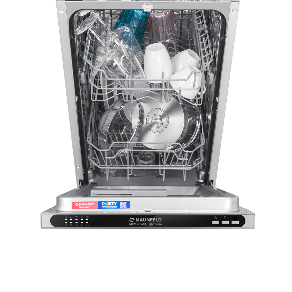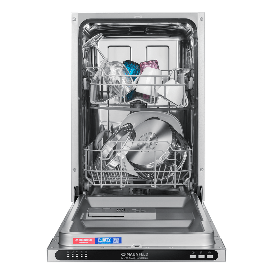 В посудомоечную машину помещается много посуды. Можно накопить её в течение дня или помыть сразу всё после семейного торжества или вечеринки с друзьями. Вместимость — до 9 комплектов посуды.