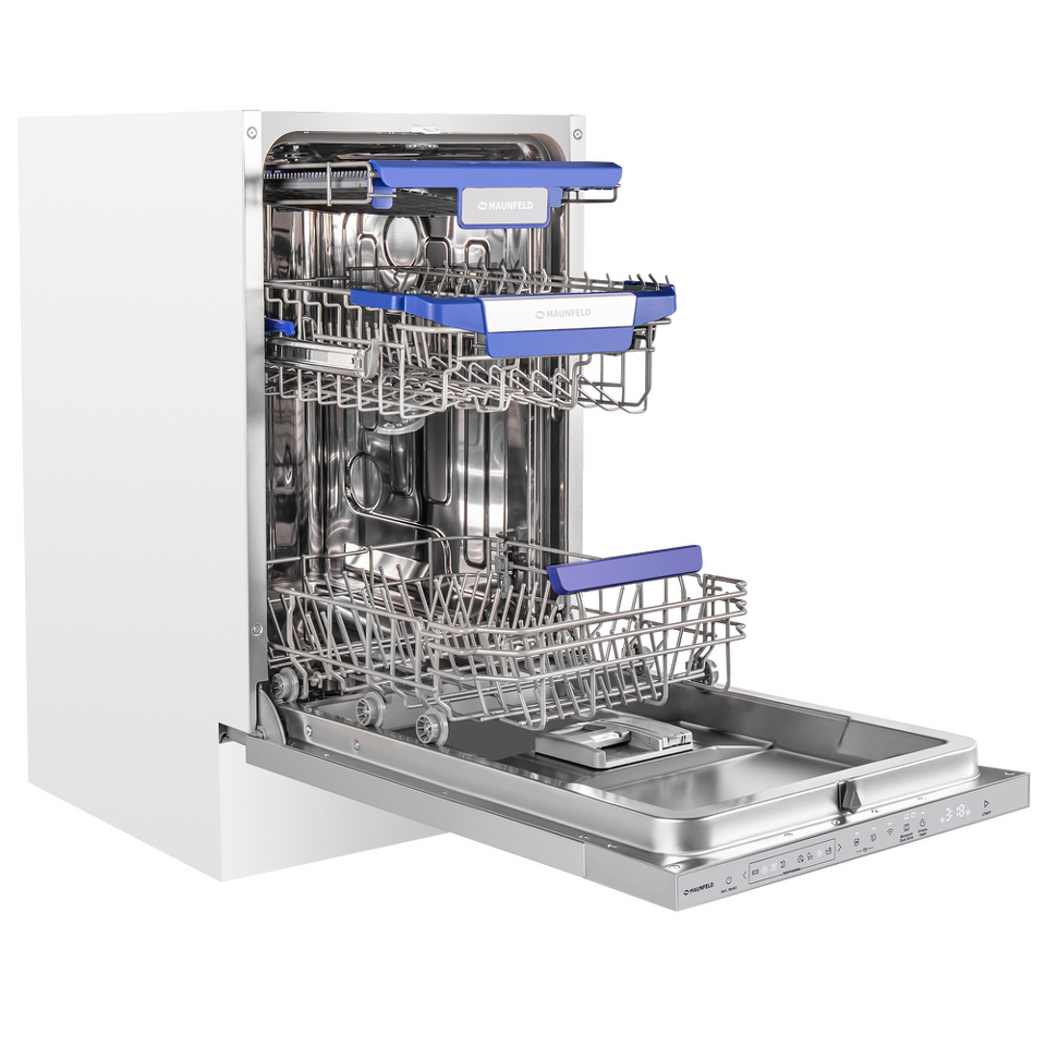 MAUNFELD MLP45330T Smart Beam Inverter Wi-Fi— это узкая модель, шириной 45 см (вместо классических 60 см), но весьма вместительная. За раз она может вымыть сразу много посуды, до 10 комплектов — это оценят в больших семьях, а также те, кто любит готовить, часто принимает гостей.