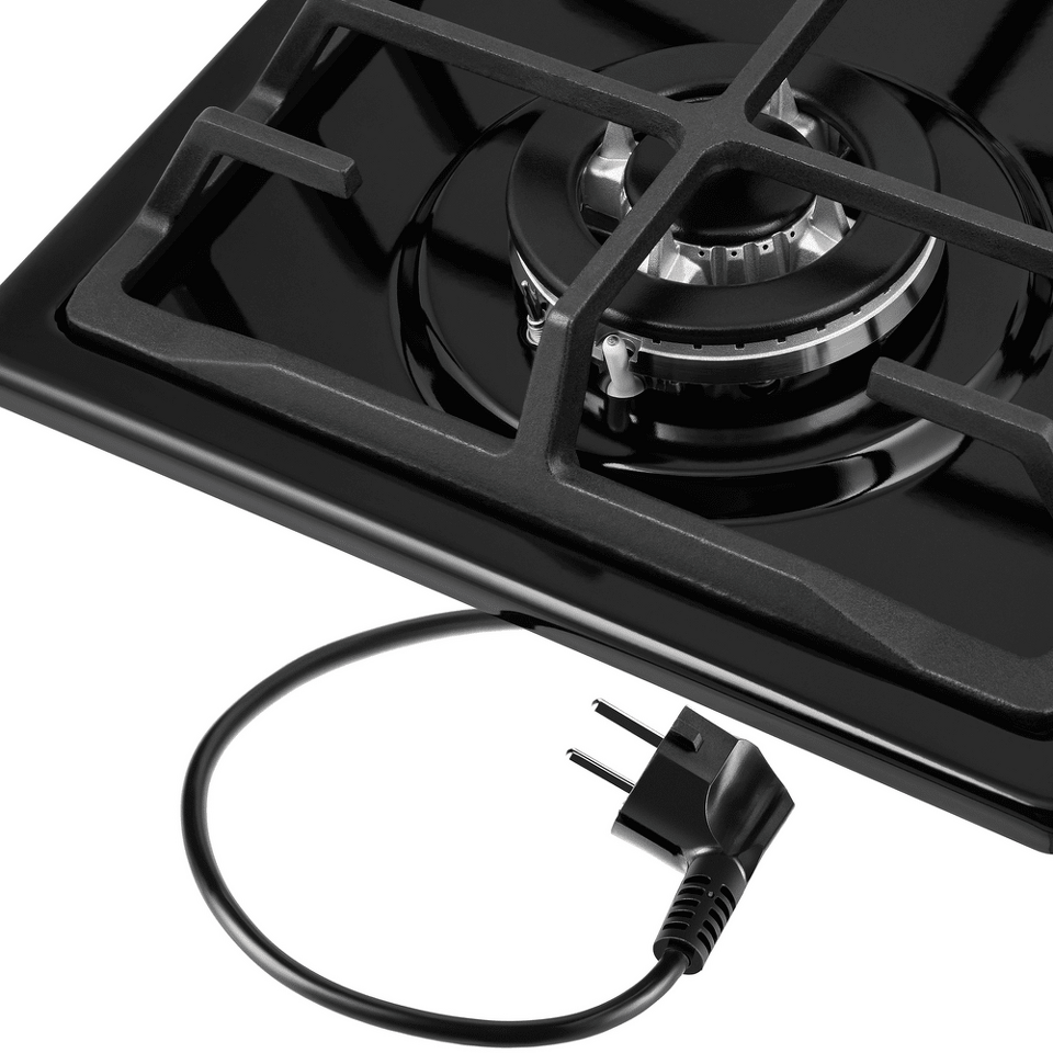 Панель выполнена из нержавеющей стали с эмалевым покрытием черного цвета. В данной модели установлены высококачественные итальянские горелки «Sabaf». Одна стандартная конфорка мощностью 1700 Вт и одна WOK-конфорка двойным пламенем мощностью 3000 Вт.