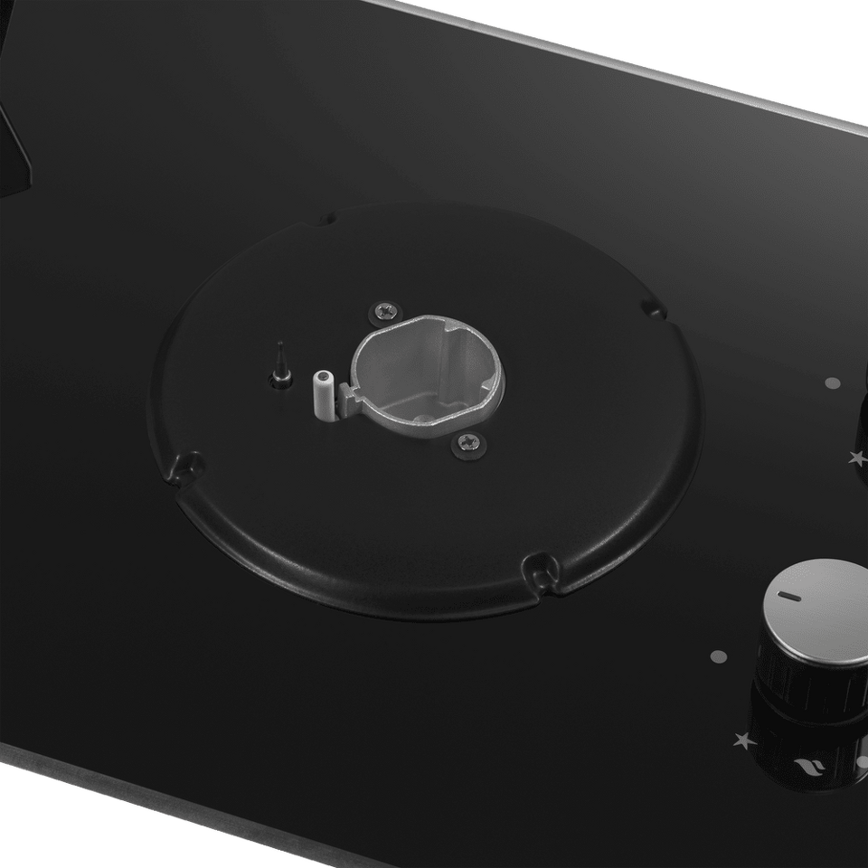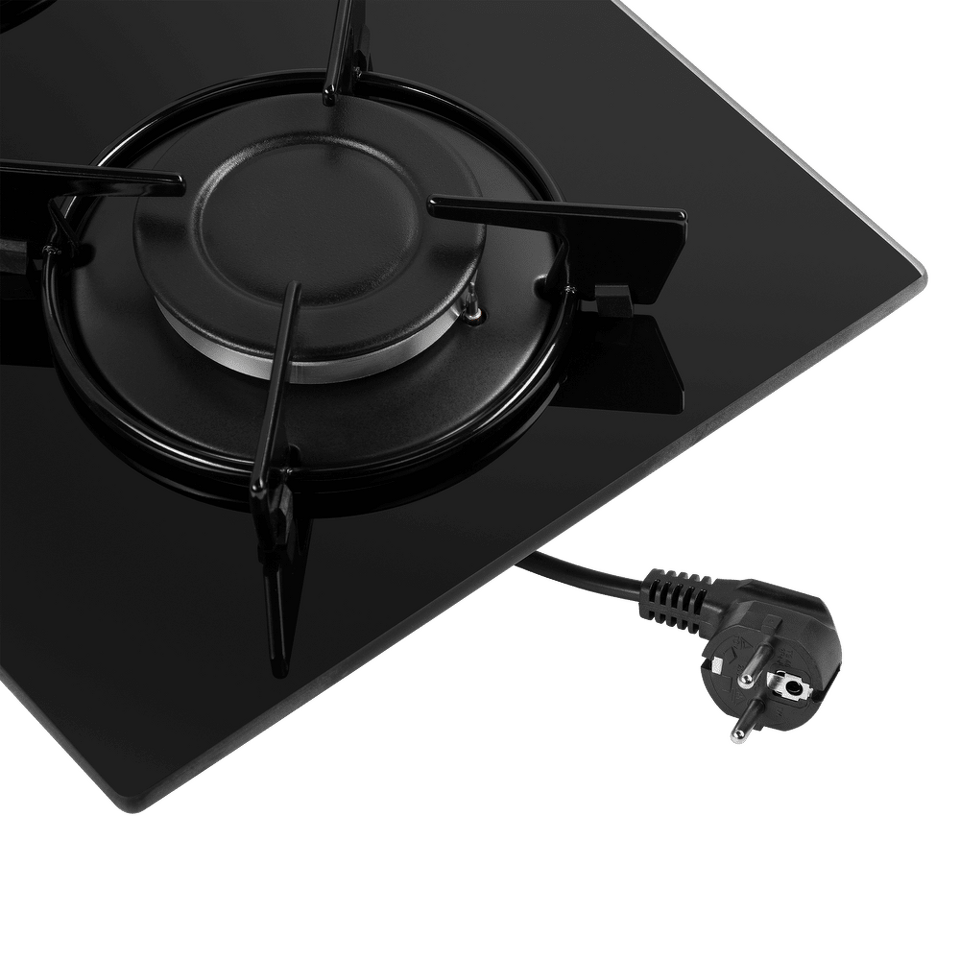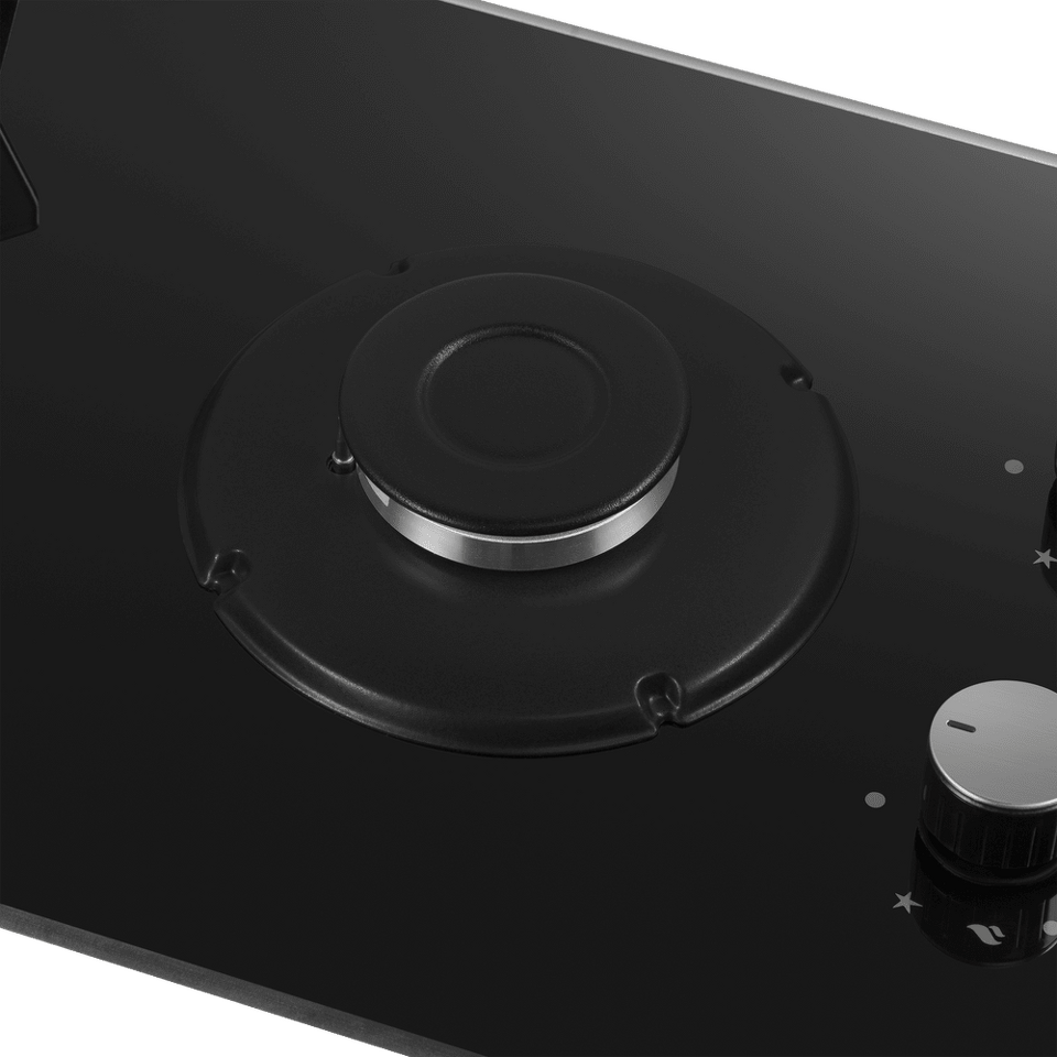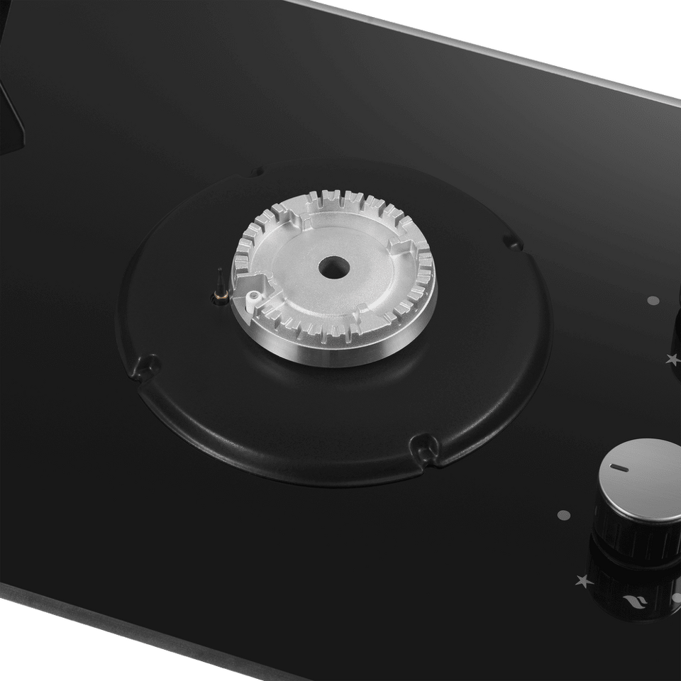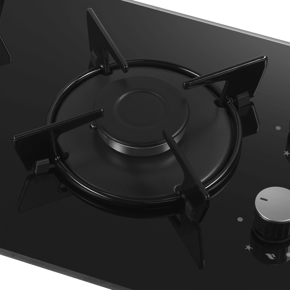 Панель выполнена из закаленного стекла черного цвета толщиной 8 мм. В данной модели установлены высококачественные горелки ALBEK. Две стандартные конфорки разного диаметра с мощностью 1700 Вт и 2600 Вт спроектированы таким образом, что огонь не перегревает ни решетки, ни ручки управления.
