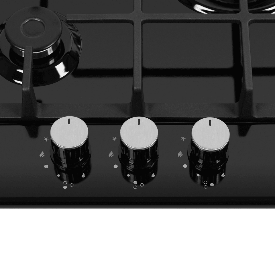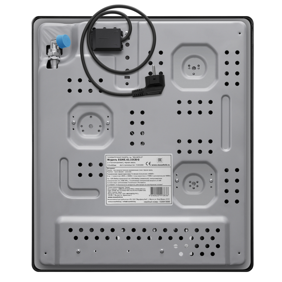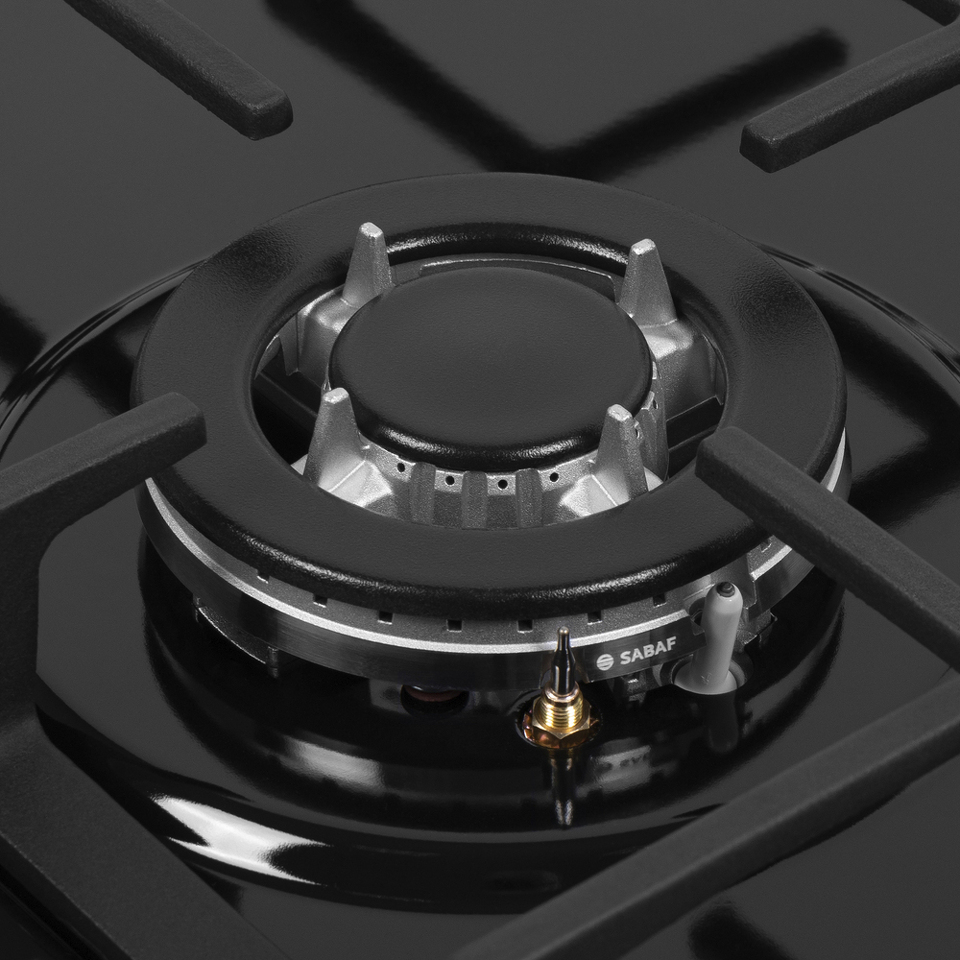 Панель выполнена из высококачественной нержавеющей  стали, покрытой прочной эмалью черного цвета. В данной модели установлены итальянские горелки SABAF. Две стандартные конфорки мощностью 1000 Вт, 1700 Вт и одна мощная WOK-конфорка с двойным пламенем мощностью 3000 Вт.
