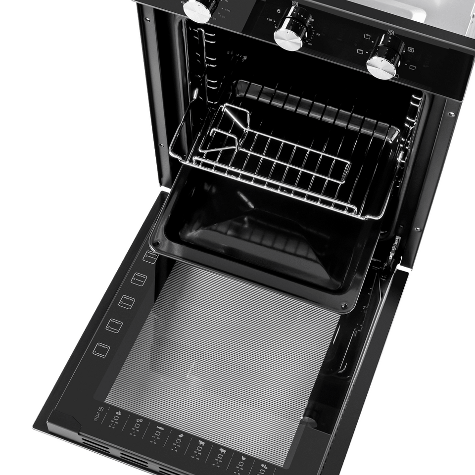 Механическое управление работой духовки осуществляется поворотными ручками. Можно установить таймер (до 120 мин), выбрать температуру (50°-250°C) и один из 7-ми режимов работы: внутреннее освещение, традиционный нагрев, большой гриль, конвекция с нижним нагревом, нижний нагрев, конвекционный нагрев, малый гриль.