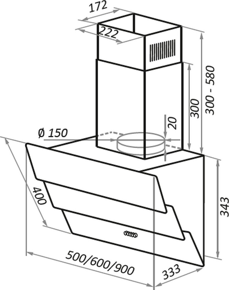 Стильная наклонная вытяжка черного цвета шириной 60 см прекрасно подойдет для кухни площадью до 20 кв.м. Монтируется на стену над поверхностью плиты и работает в двух режимах – отвода (при подключении к системе вентиляции) и рециркуляции (при использовании сменного угольного фильтра).