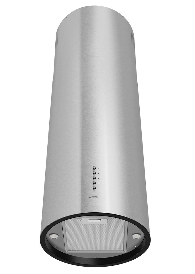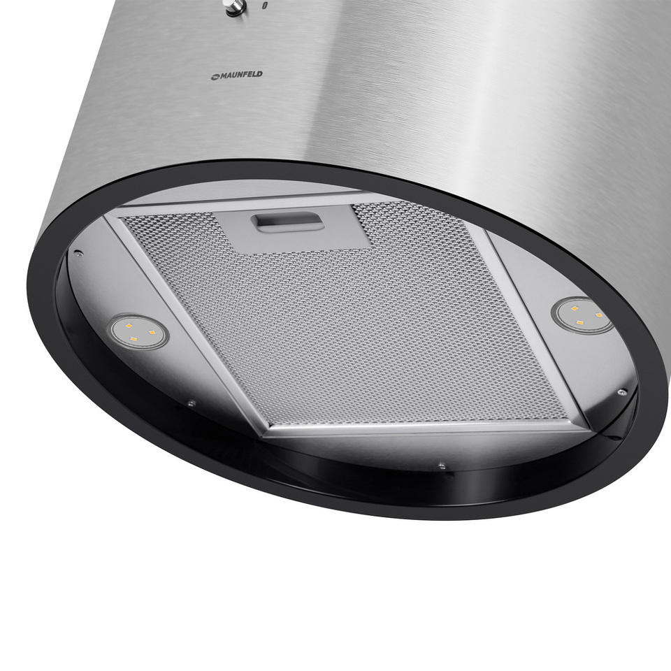Корпус цилиндрической формы сделан из матированной нержавеющей стали. Торец нижней части вытяжки выполнен акцентным черным цветом. Многослойный жироулавливающий фильтр легко вынимается и полностью разбирается для чистки.