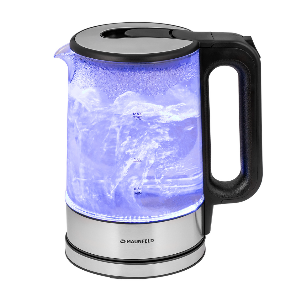 Элегантный чайник мощностью 2 200 Вт и объемом 1,7 л представляет собой идеальную комбинацию металлического основания и колбы из жаропрочного стекла.