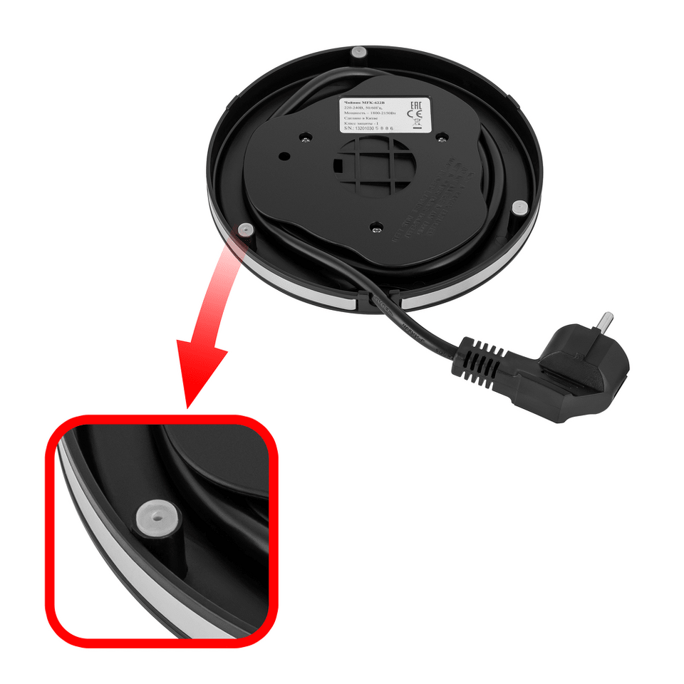 На ручке предусмотрена хромированная кнопка автоматического открывания. Окошко с индикатором уровня воды находится непосредственно на корпусе чайника. Кнопка включения/выключения с голубой подсветкой располагается под ручкой В носике крепится съемный фильтр, который легко достается и моется.