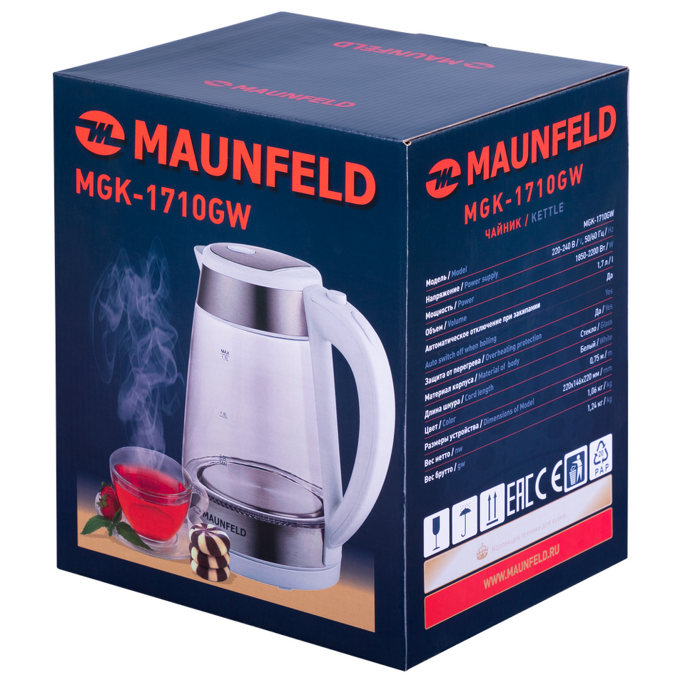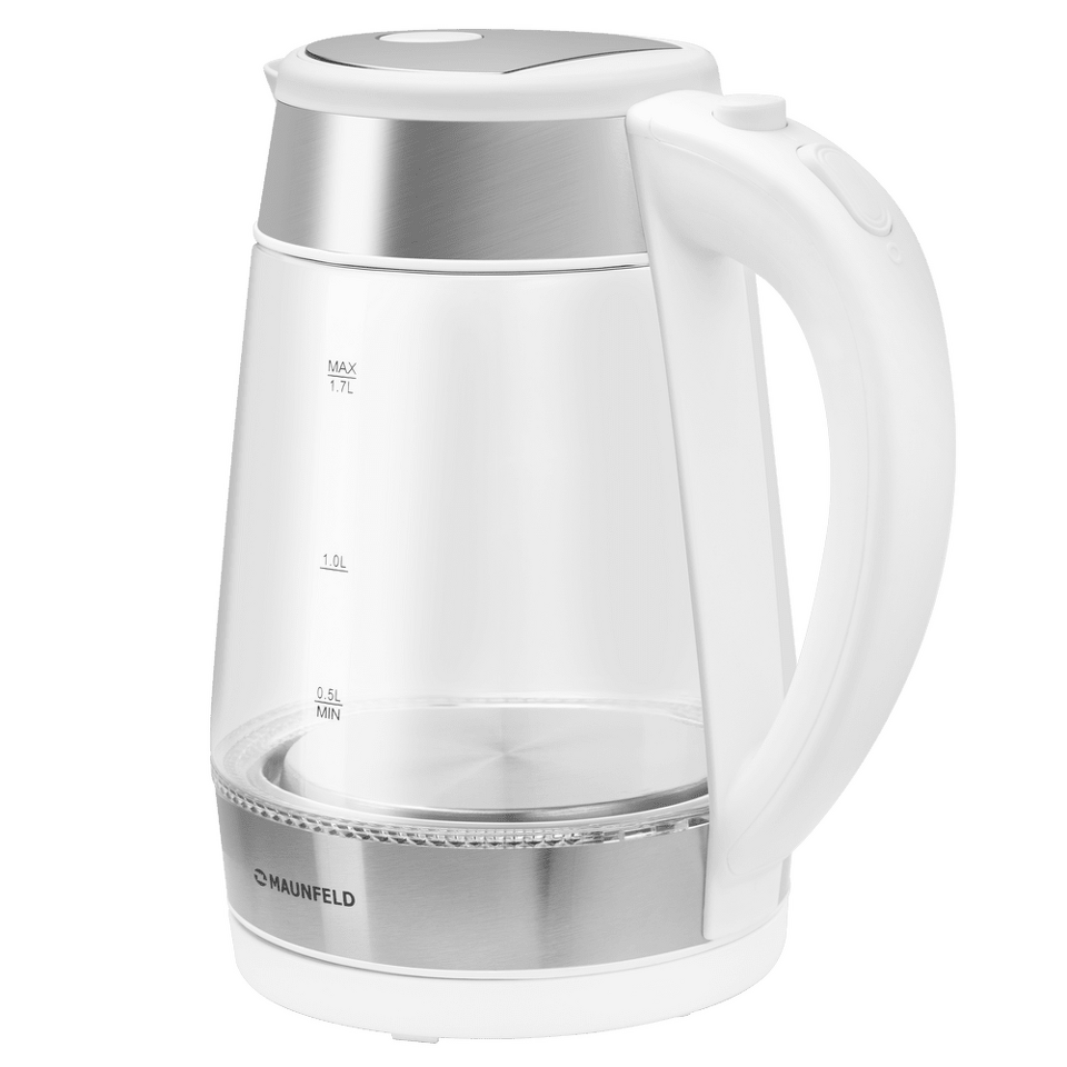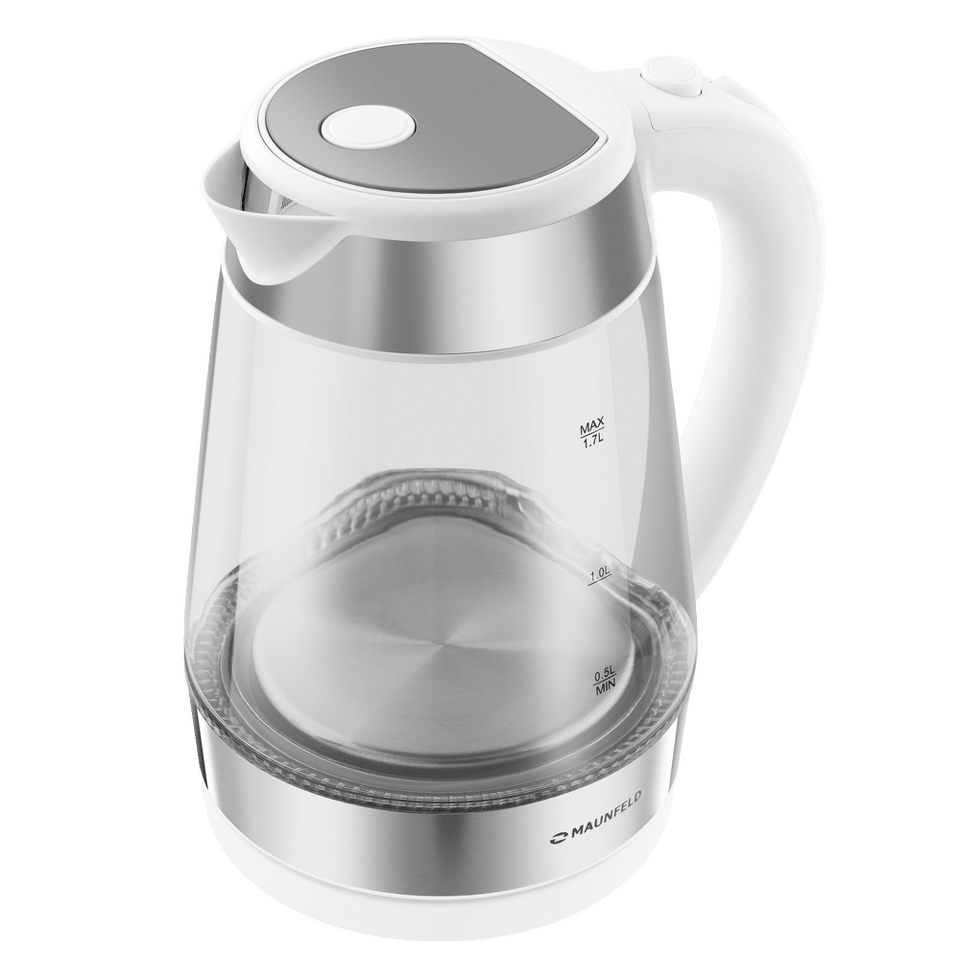 Элегантный чайник мощностью 2 200 Вт и объемом 1,7 л представляет собой идеальную комбинацию металлического основания и колбы из жаропрочного боросиликатного стекла, которая легко моется.