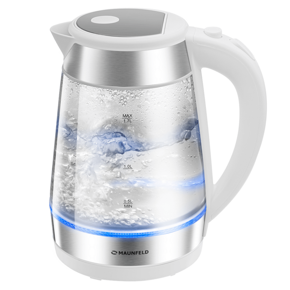 Элегантный чайник выполнен из жаропрочного боросиликатного стекла и металла. Светодиодная подсветка голубого цвета вокруг нагревательного элемента.
