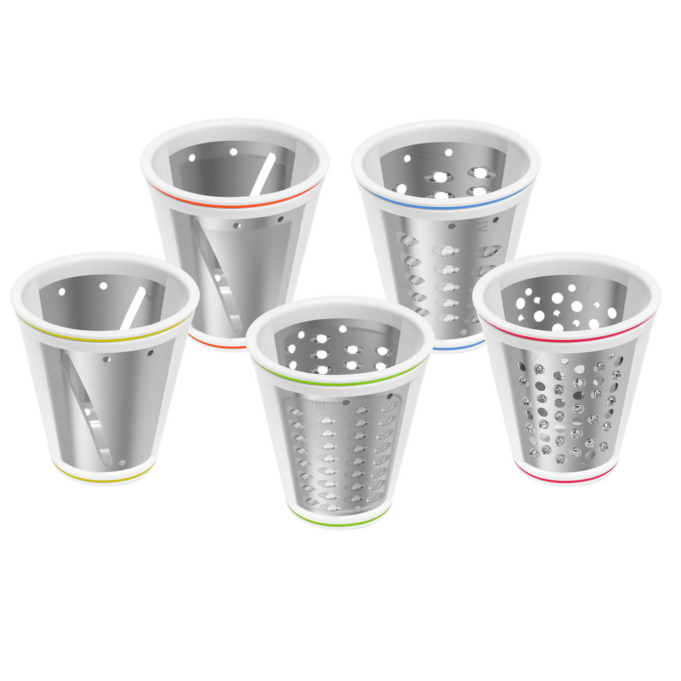 Благодаря 5 насадкам-конусам овощерезка позволяет натирать, нарезать кусочками и ломтиками овощи, фрукты, сыр или даже шоколад прямо в тарелку и сразу подавать на стол. Каждый конус имеет свой собственный цвет, чтобы вы могли одним взглядом выбрать нужную насадку. Овощерезка оснащена увеличенным загрузочным отверстием, чтобы вам не пришлось нарезать продукты заранее. Эта машина для нарезки овощей и других продуктов способна украсить любой интерьер благодаря стильному и компактному корпусу и продуманному хранению шнура и аксессуаров.
