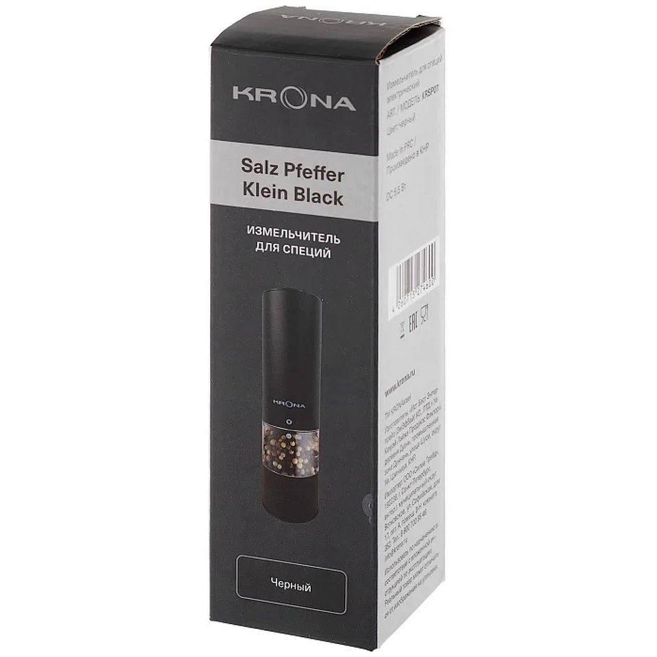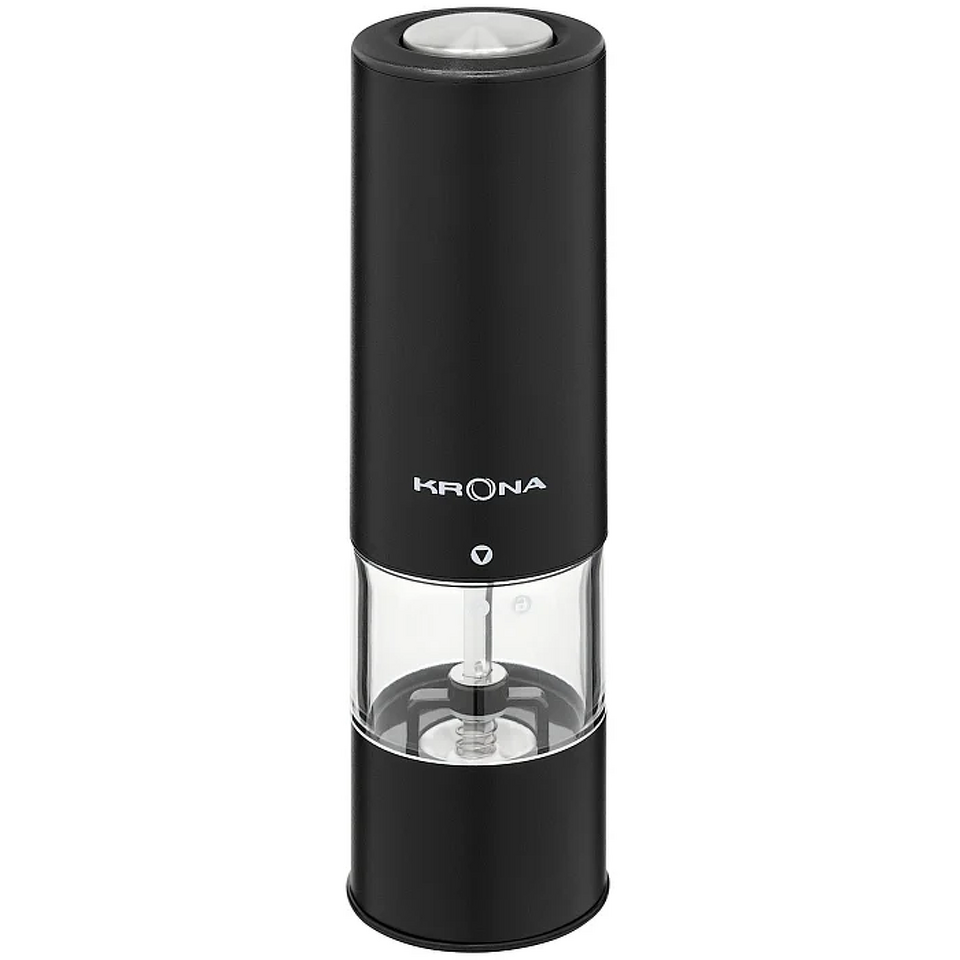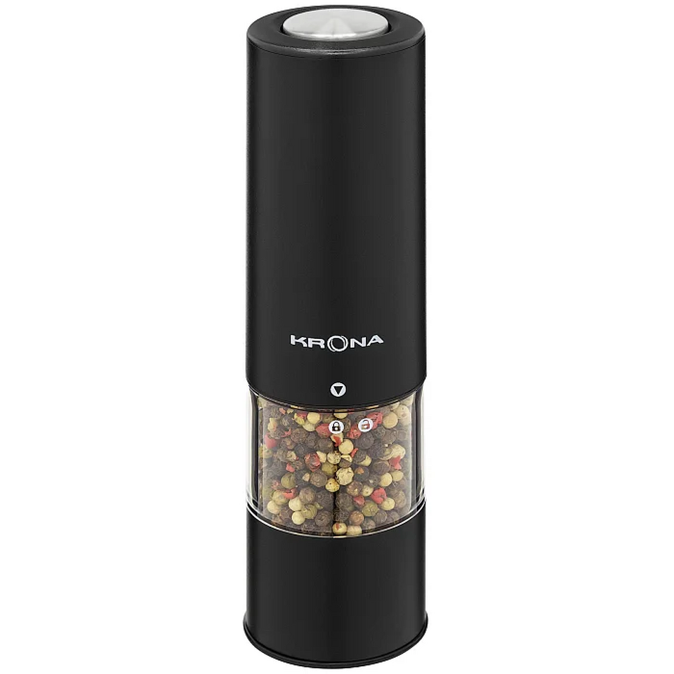 Электрический измельчитель KRONA Salz Pfeffer Klein Black — идеальное сочетание стиля и функциональности для вашей кухни. Этот универсальный измельчитель с легкостью справится с солью, перцем, крупными специями и даже сушеными травами. Все что нужно — это нажать кнопку, и мельница мгновенно сделает свою работу, обеспечивая быстрый и равномерный помол. Этому способствуют надежные керамические жернова и плавная регулировка степени помола — от мелкого до крупного, чтобы раскрыть максимум вкуса и аромата специй в любом блюде. Встроенная подсветка сделает использование устройства особенно удобным, позволяя точно дозировать количество специй даже при слабом освещении. Прочный металлический корпус в элегантном черном цвете не только выглядит стильно, но и обеспечивает длительный срок службы. Компактный размер устройства позволяет легко найти для него место на кухонной полке или столе. Съемный контейнер объемом 70 мл легко наполнить, а благодаря подставке-заглушке измельчитель удобно хранить, не боясь, что специи случайно просыпятся.