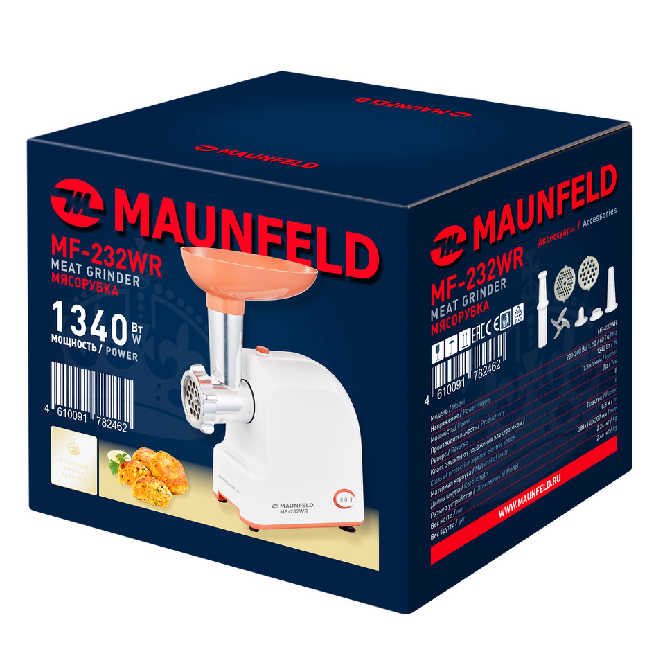 Электрическая мясорубка оснащена мощным мотором 1340 Вт, что обеспечивает производительность 1,3 кг в минуту.