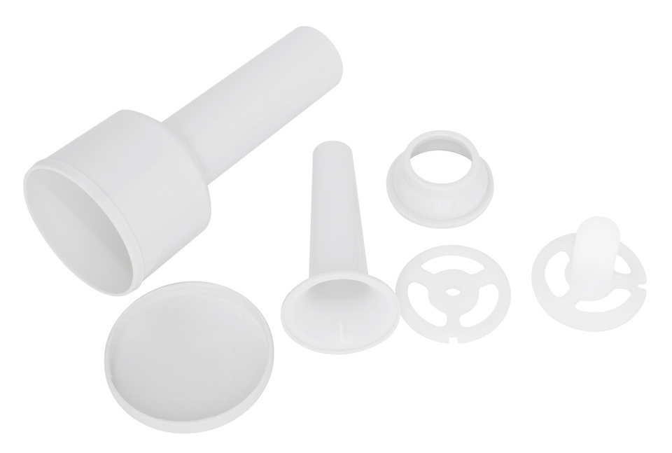Пластиковый толкатель - это еще одна эргономичная разработка данной модели, о которой стоит упомянуть. Выполненный в белом цвете, толкатель одновременно является контейнером для хранения разнообразных насадок, используемых для изготовления колбасных изделий и кеббе.