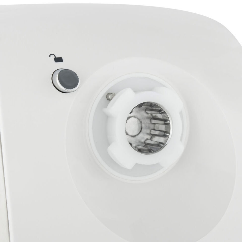Элегантный белый пластиковый корпус со вставкой цвета металлик - отличительная особенность этой модели. Сама насадка-мясорубка выполнена полностью из металла и укомплектована 3-мя дисками с диаметром отверстий 3, 4.8 и 8 мм, что позволяет получить фарш разной фракции. Диски очень удобно хранить в специальном отсеке в корпусе. Поддон для подачи мяса в мясорубку изготовлен из алюминия. В нижней части находится отсек для хранения сетевого шнура.