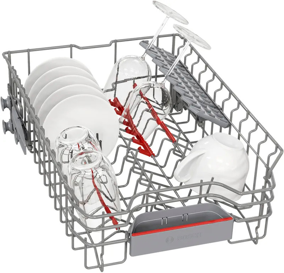 Встраиваемая посудомоечная машина Bosch SPV4HMX55Q представляет собой современное и функциональное решение для вашей кухни. Она идеально вписывается в любой интерьер благодаря своему узкому дизайну и элегантной черной панели управления. На панели расположены кнопки управления и информативный дисплей, который показывает наличие ополаскивателя, соли и время до окончания программы.