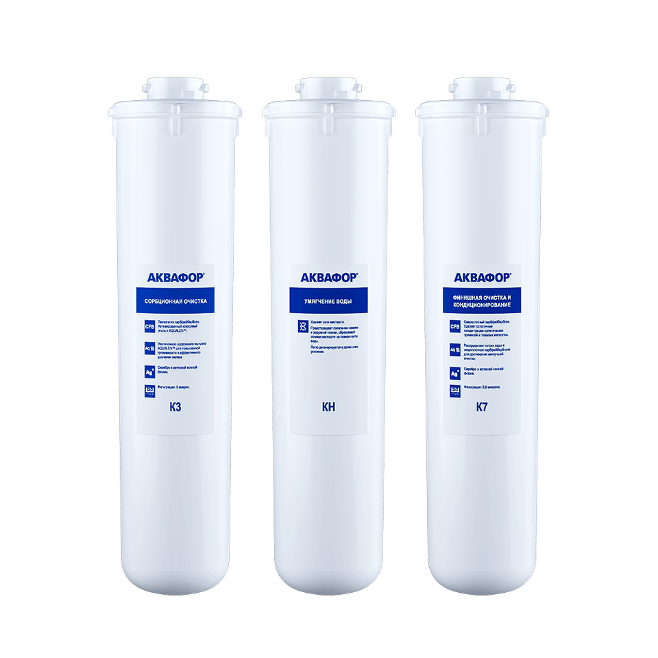 Комплект сменных модулей К3-KН-K7 обеспечивает глубокую очистку воды от хлора, органических соединений и других примесей.