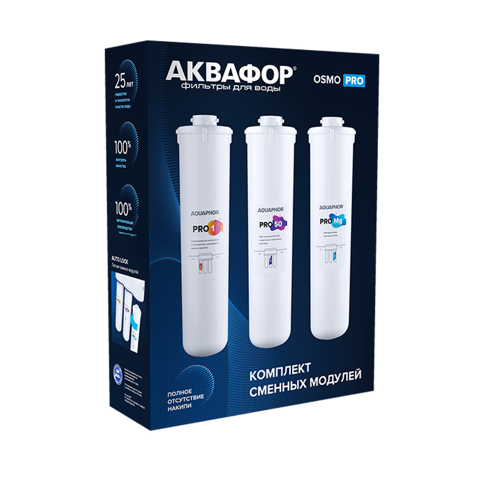 В комплект входит комбинация из трех сменных модулей Pro 1, Pro 100 и Pro Mg для обратноосмотической системы Аквафор Osmo Pro 100. Производительность мембраны Pro 100 составляет 380 литров (100 галлонов) в сутки.*