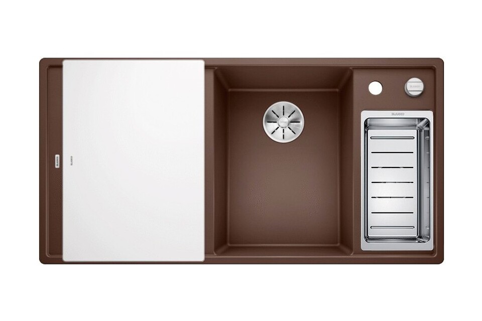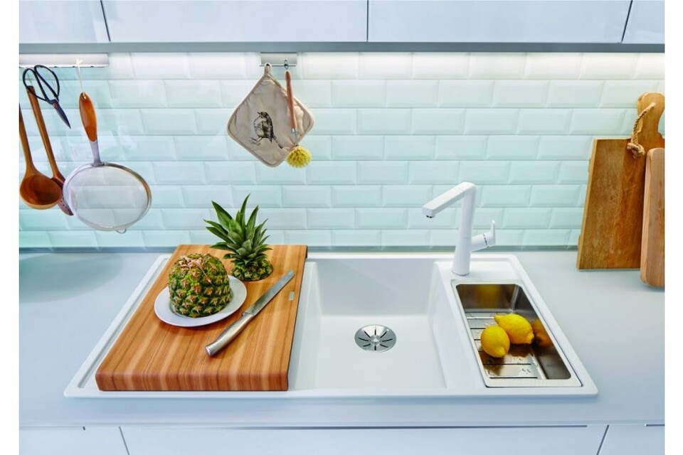 Стеклянная разделочная доска скользит по поверхности мойки, нарезанные продукты можно сбрасывать в посуду или многофункциональный коландер, находящеся в мойке.