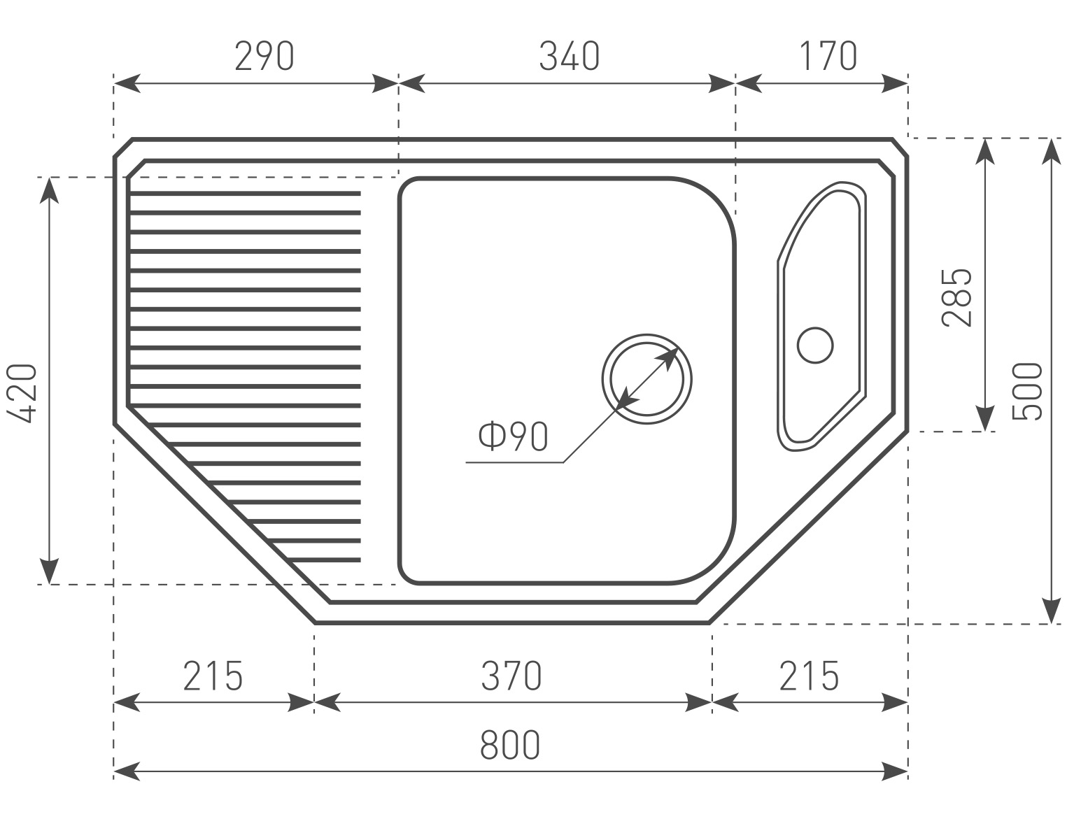 Первое, что бросается в глаза – это нестандартная, современная эргономичная форма. Модель ECKIG 800 представляет собой изумительную альтернативу прямолинейной двухсекционной мойке. Эта симметричная угловая мойка выполнена из натурального гранитного камня и имеет отличные показатели качества и высокой функциональности. Раковина предназначена для встройки в угловую секцию столешницы, что позволяет использовать пространство с максимальной рациональностью. Конструкция имеет две чаши разных размеров: основная, прямоугольной формы, с закруглёнными углами, расположена посередине, а вторая маленькая неправильной формы находится сбоку от неё. На противоположной стороне размещено удобное треугольное крыло, на котором можно сушить вымытую посуду, а также размещать продукты для разморозки или сушки. Материал мойки настолько прочный, что на поверхности можно даже резать продукты и разделывать мясо. Что примечательно, углублённое закругление слева в основной рабочей полости, позволяет разместить в чаше посуду даже с длинными ручками, не наклоняя её и не уменьшая полезный объём мойки.