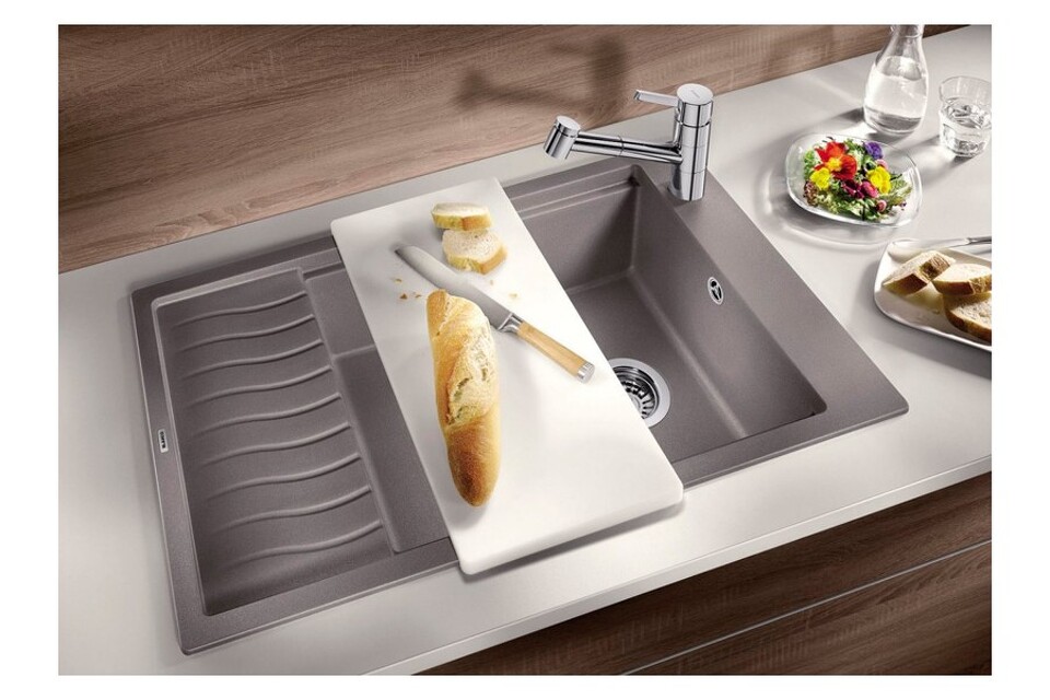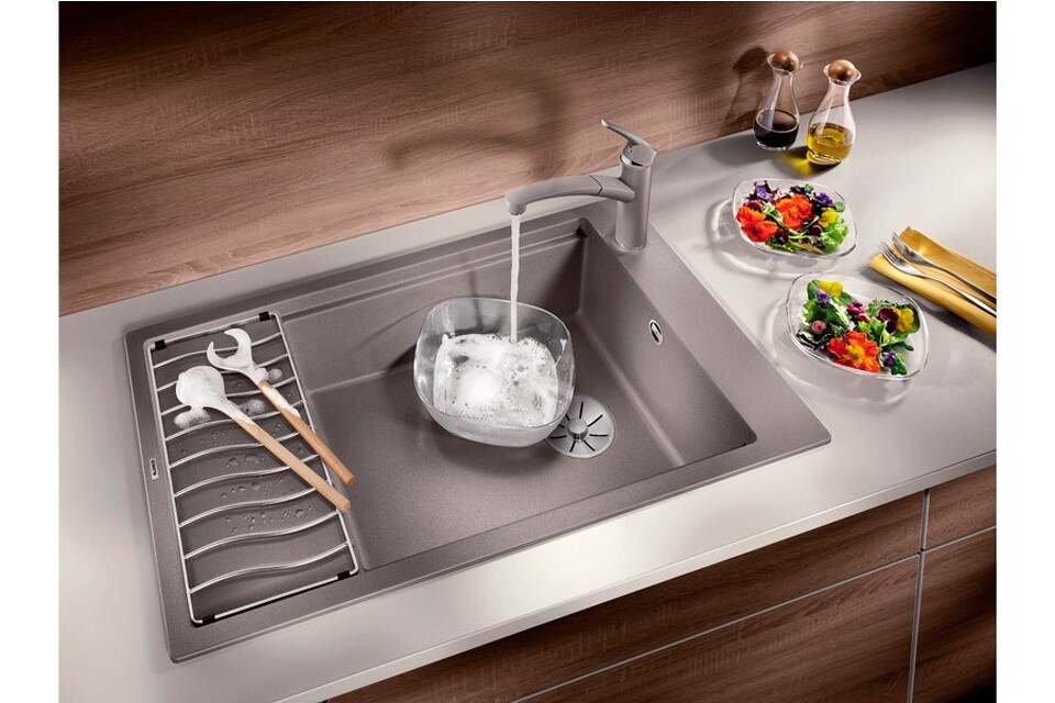 Ширина данной Мойки Blanco Elon XL 8 S SILGRANIT PuraDur составляет целых 86 см, при этом параметры чаши 50×41 см при глубине почти двадцать сантиметров. Это достаточно удобно, поскольку внутрь поместятся даже сотейники и габаритные кастрюли. Цвет антрацит для такого рода изделий достаточно нетипичный. При этом он отлично впишется в современный, а также ретро-интерьер. Принято считать, что на нём меньше видно разводов и грязи. Но, тем не менее, раковина требует ухода. Хотя он будет прост, поскольку модель изготовлена из силгранита.