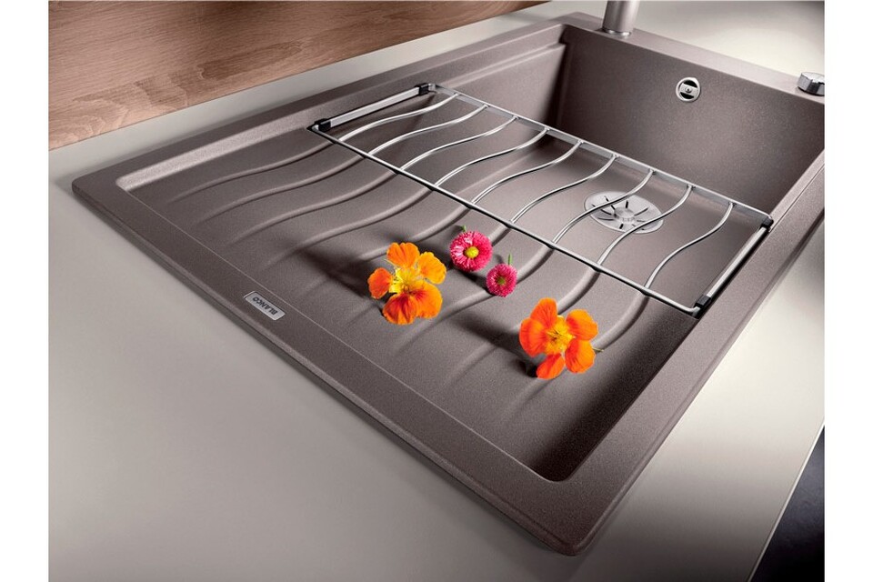 Данная модель оснащена клапаном-автоматом, изготовленным по технологии InFino. При нажатии на кнопку корзинчатый вентиль перекрывает или открывает слив, что позволяет экономить воду и при этом уберечь руки от погружения в неё. В комплект также входит накладная решётка из нержавеющей стали. На ней удобно сушить посуду вроде чашек и тарелок. Столовые приборы стоит класть аккуратно, чтобы не упали.
