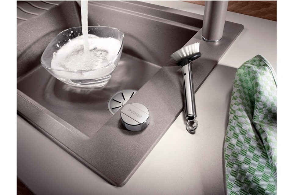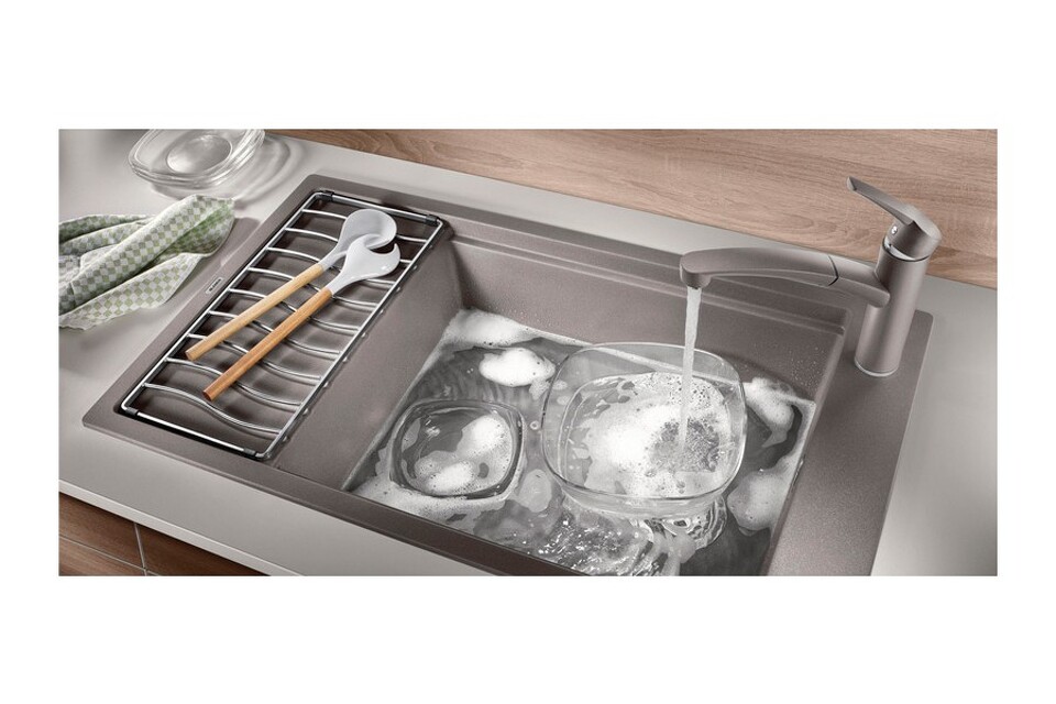 Данная модель оснащена клапаном-автоматом, изготовленным по технологии InFino. При нажатии на кнопку корзинчатый вентиль перекрывает или открывает слив, что позволяет экономить воду и при этом уберечь руки от погружения в неё. В комплект также входит накладная решётка из нержавеющей стали. На ней удобно сушить посуду вроде чашек и тарелок. Столовые приборы стоит класть аккуратно, чтобы не упали.