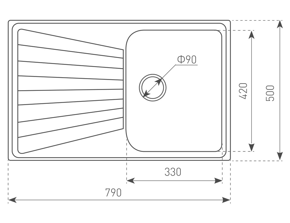 Просторная чаша и обширное крыло выделяют KLASSISCH 790 среди подобных моделей. Её габаритные размеры – 790*500 мм, при чаше глубиной в 19см. KLASSISCH 790 – это действительно классический вариант, не имеющий ничего лишнего. Чаша занимает около половины всей ширины раковины, и дополняется крылом, свободно прилегающим к поверхности столешницы. Если столешница попадает в тон и фактуру раковины, то не сразу можно разобрать, где кончается мойка и начинается рабочая часть стола, особенно если добавить к этому гармоничную прямоугольную форму. Материал мойки – гранит. Специфические свойства поверхности придают раковине особую прочность и инертность к воздействию химических веществ различного происхождения.