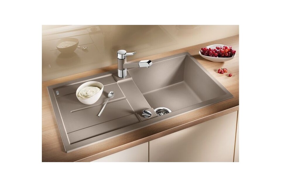 Каменная мойка Blanco Metra 5S имеет имеет более десятка цветовых решений от светлого песочного до стильного кофейного. Для любителей классики предлагаются белый и угольно-черный. Чаша модели прямоугольная, а крыло имеет рельефную поверхность, облегчающую сушку посуды, размораживание и обработку продуктов питания.