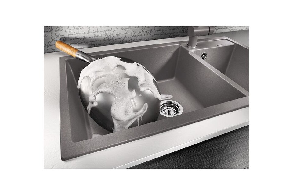Бланко Metra 9 имеет две чаши с корзинчатыми вентилями. Чаша побольше может быть использована для мытья или замачивания крупногабаритной посуды. Для экономии воды и времени, овощи и фрукты моются в маленькой чаше. А положив поверх большой разделочную доску, удобно будет сразу же нарезать необходимые ингредиенты.