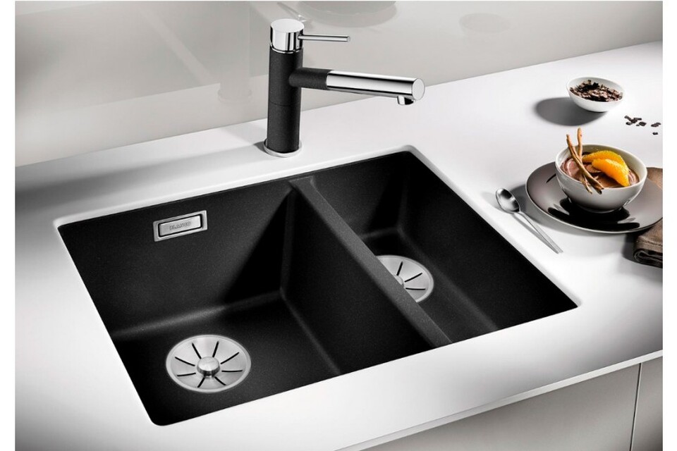 Монтаж мойки Blanco SUBLINE 340/160-U SILGRANIT чаша слева, отводная арматура InFino осуществляется под столешницу. Это делает изделие визуально более аккуратным. Кроме того, если в процессе мытья вода попадёт на столешницу, то её легко направить в раковину. Есть линейка цветов, которые отлично впишутся практически в любой интерьер:алюметалик,антрацит,белый,жасмин,кофе,серый беж,шампань,темная скала,жемчужный,черный.