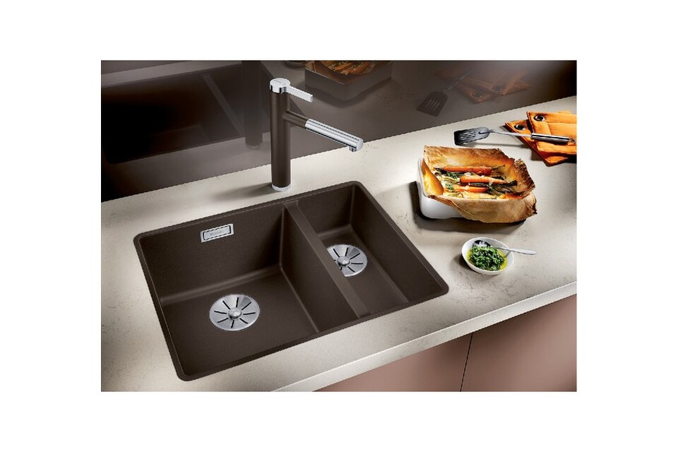 Монтаж мойки Blanco SUBLINE 340/160-U SILGRANIT чаша слева, отводная арматура InFino осуществляется под столешницу. Это делает изделие визуально более аккуратным. Кроме того, если в процессе мытья вода попадёт на столешницу, то её легко направить в раковину. Есть линейка цветов, которые отлично впишутся практически в любой интерьер:алюметалик,антрацит,белый,жасмин,кофе,серый беж,шампань,темная скала,жемчужный,черный.