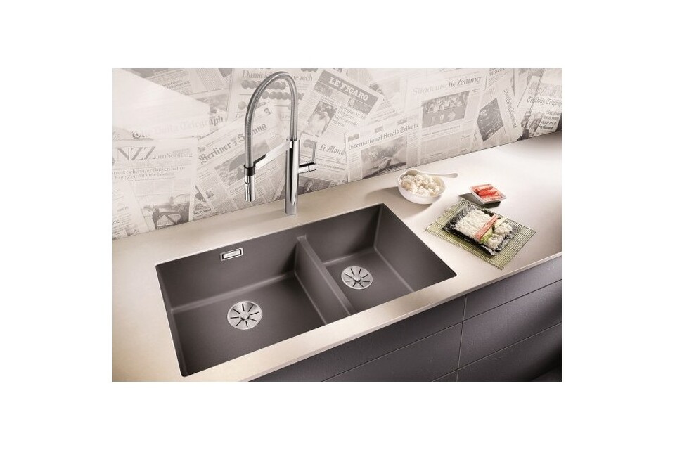 Сама раковина состоит из двух чаш разного диаметра. Конструкция мойки Blanco SUBLINE 480/320-U отводная арматура InFino занимает место 90×46 см. Это достаточно много, поэтому уместнее использовать её на кухнях большого или среднего размера.