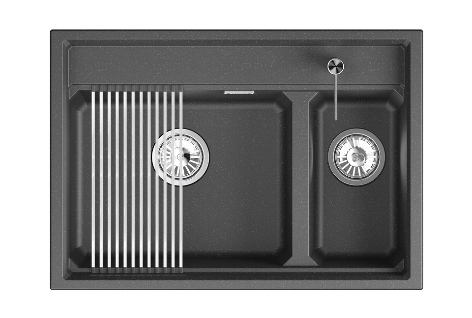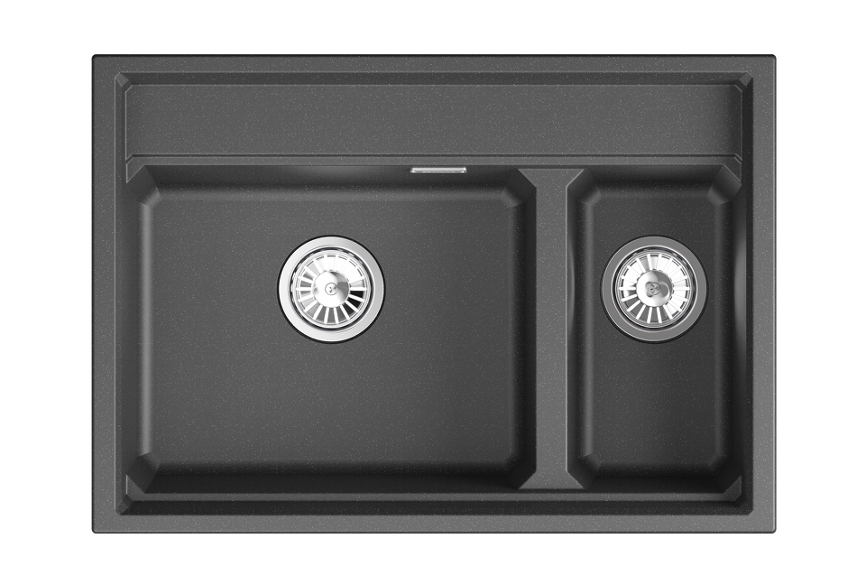 Мойка Granula с двумя чашами - идеальное решение для эффективной работы на кухне! Широкая чаша для мытья большой посуды, узкая чаша - для ополаскивания и мойки фруктов, овощей и мелкой посуды. Материал - кварцевый песок, прочный и износостойкий. Форма чаши адаптирована под функциональный ролл-мат. Мойка легко моется и устойчива к высоким температурам. В комплекте: ролл-мат, дозатор жидкого мыла, сифон.