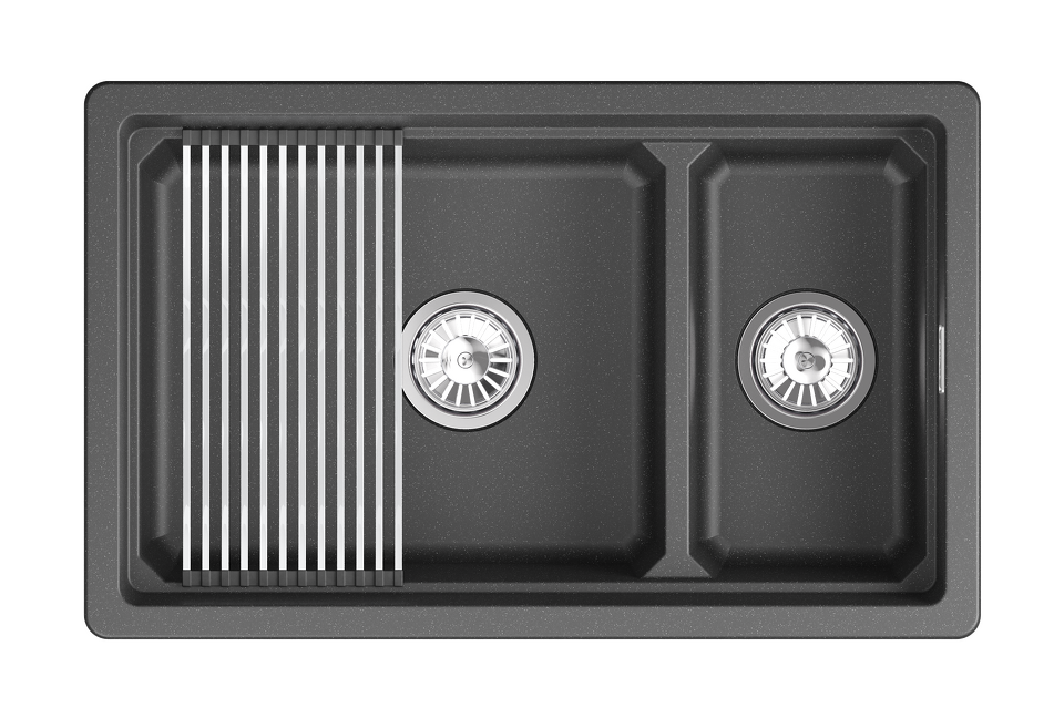 Двухсекционная мойка прямоугольной формы для установки под столешницу в шкаф 800мм. В каждой чаши мойки есть удобная площадка для установки ролл-мата или разделочной доски. Мойка выполнена из кварцевого композитного материала высокой плотности и гигроскопичности, что обеспечивает не менее 20 лет надежной эксплуатации. Ролл-мат и дозатор из нержавеющей стали уже включены в комплект. Выберите GRANULA KS-7804U, чтобы получить привлекательный и удобный аксессуар для вашей кухни.