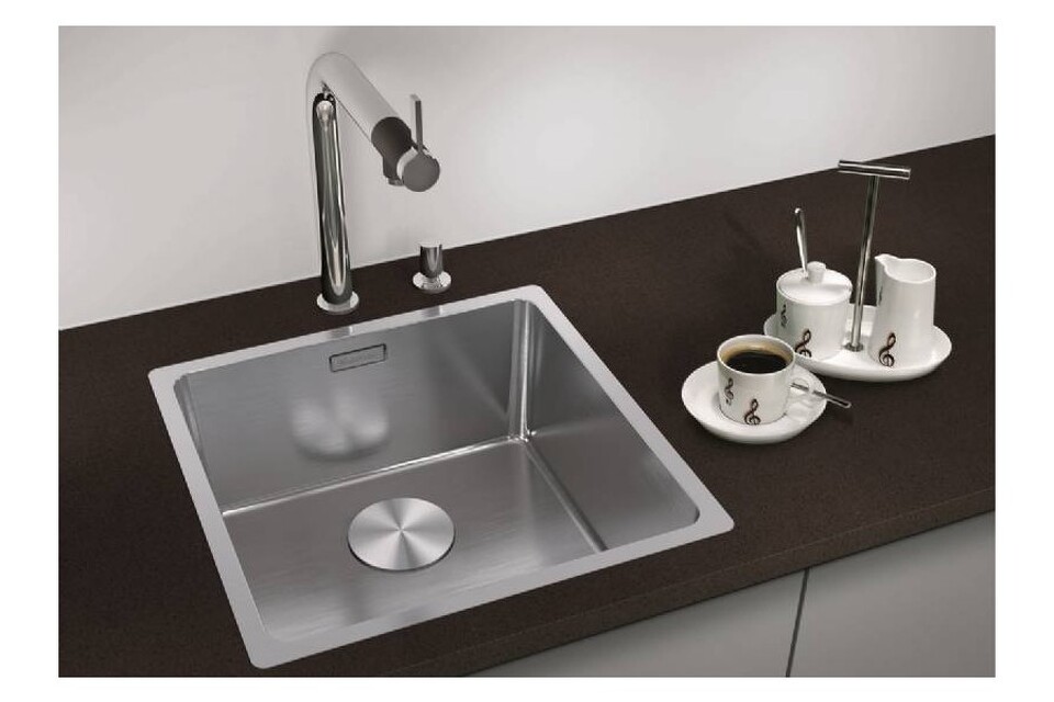 Для изготовления Бланко Andano 400-IF использована нержавеющая сталь Premium 18/10. Толщина стенок составляет 0,9 мм, этого достаточно, чтобы заглушать звук льющейся воды, гремящей посуды. Мойка устойчива к механическим повреждениям, не боится ржавчины, царапин, отложения извести. Цвет сохранит первозданный вид спустя годы — полировка имеет защитный барьер от ультрафиолета, инертна к пищевым красителям, отталкивает жир и другие загрязнения. Материал абсолютно безвреден для здоровья человека и животных, имеются необходимые сертификаты соответствия европейским нормам качества и безопасности.