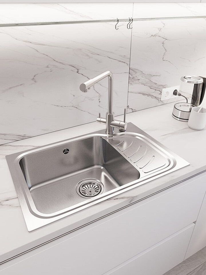 Мойка из нержавеющей стали AISI. AISI 304 содержит 18% хрома и 9% никеля, что обеспечивает максимальную устойчивость к коррозии. Шлифованная поверхность моек OULIN достигается по технологии Satin Finish Brushing.