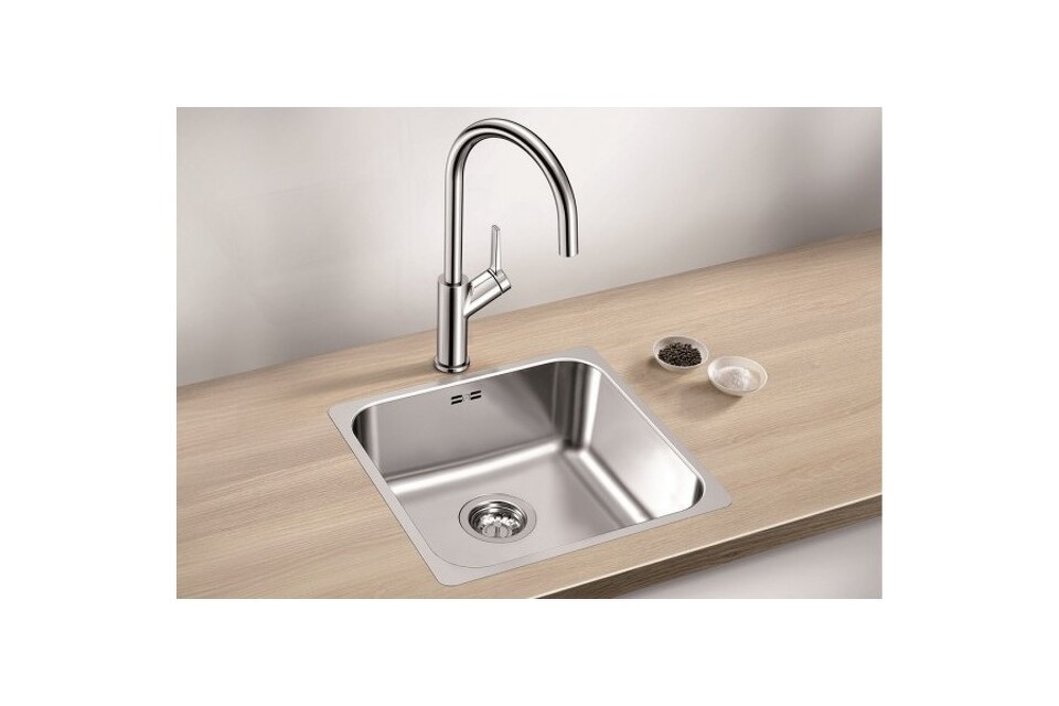 Выполняется из прочной нержавеющей стали 0.9 мм, материал благодаря гладкости отличается гигиеничностью и устойчивостью даже к сложным загрязнениям. Функциональность Бланко Supra 400-IF можно расширить при помощи аксессуаров: корзина из нержавеющей стали и пластиковый поддон. Мойка с новым артикулом 526350 отличается радиусом скругления канта R12, на моделях предыдущего поколения арт.523356 — R20.