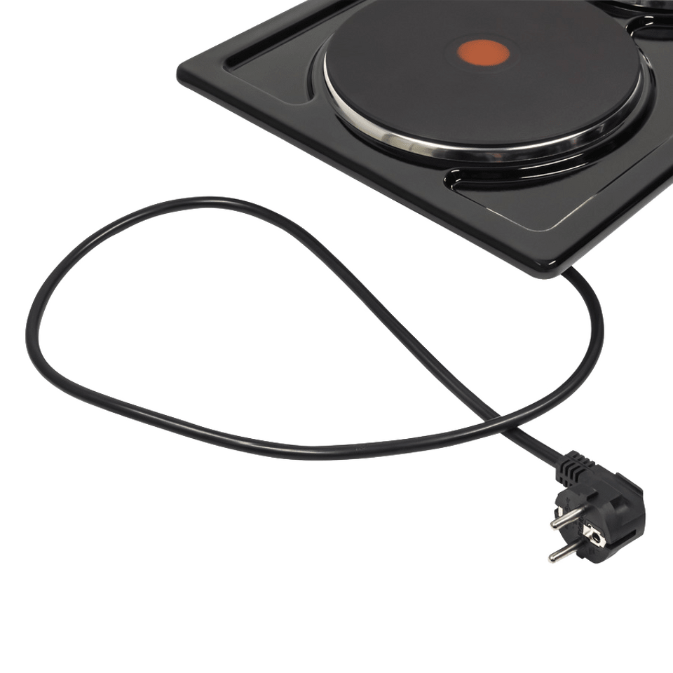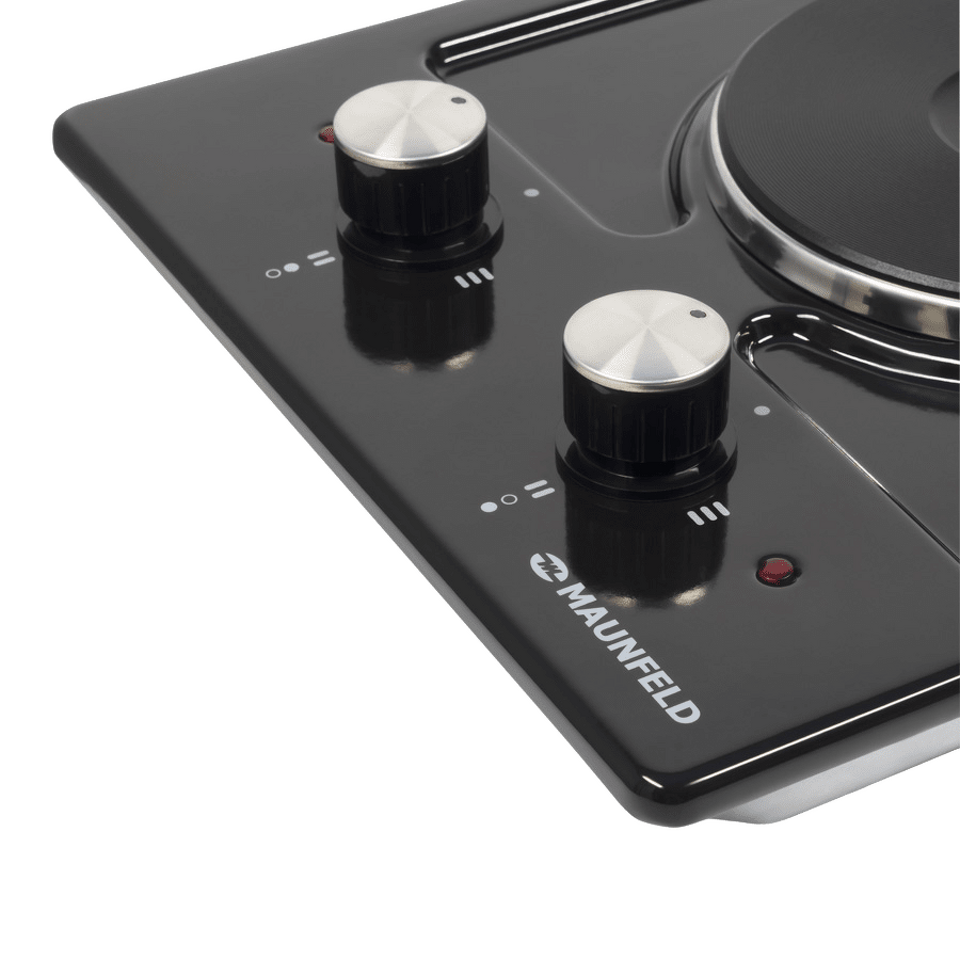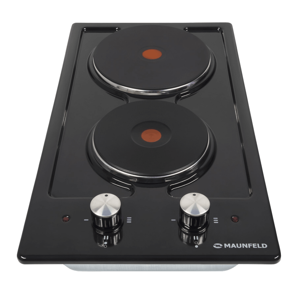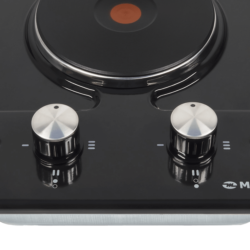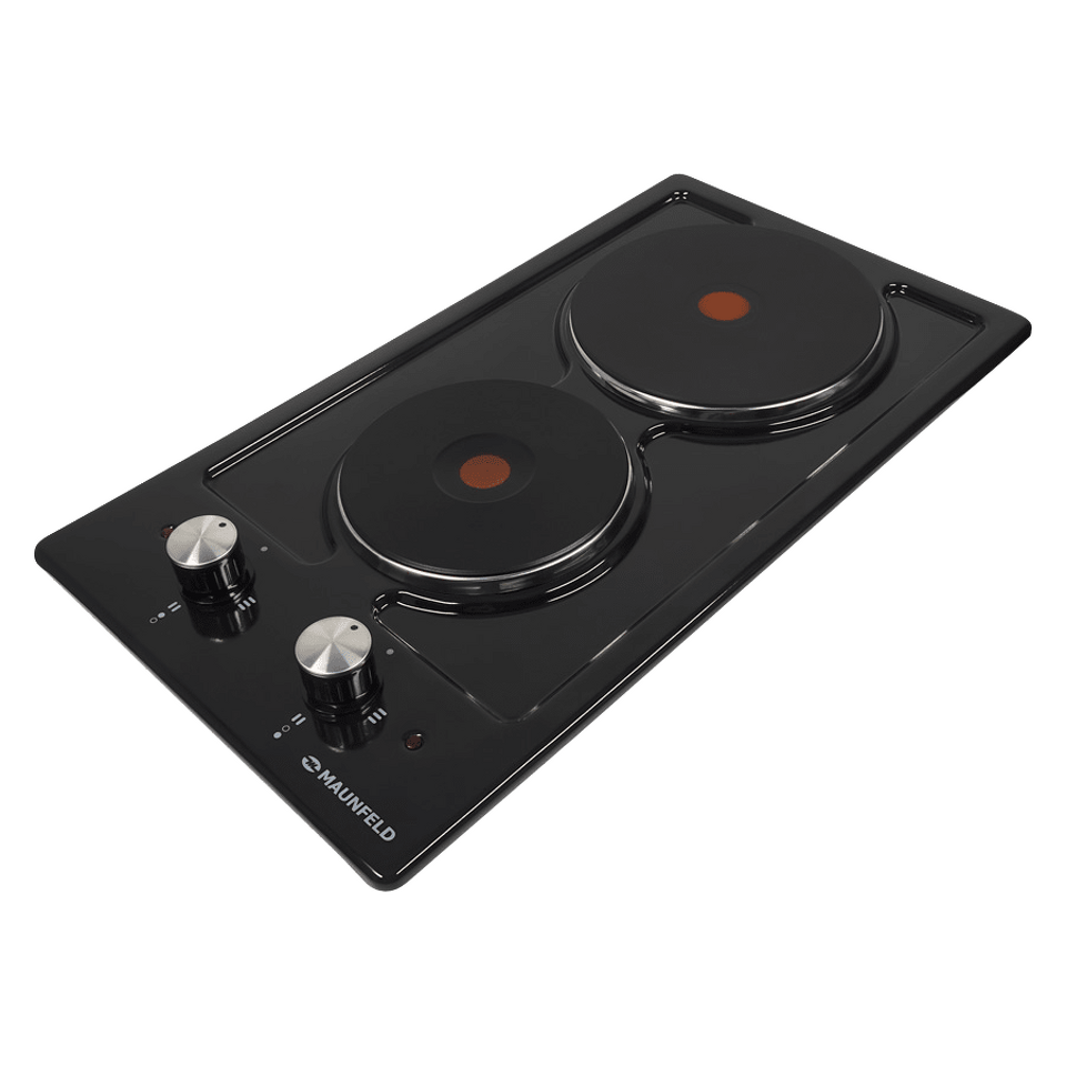 Оборудована 2-мя прочными чугунными конфорками быстрого нагрева HP RAPID со стальной окантовкой: одна конфорка мощностью 1500 Вт (d=150 мм)  вторая -  мощностью 1500 Вт (d=185 мм). Красный круг по центру – индикатор нагрева.