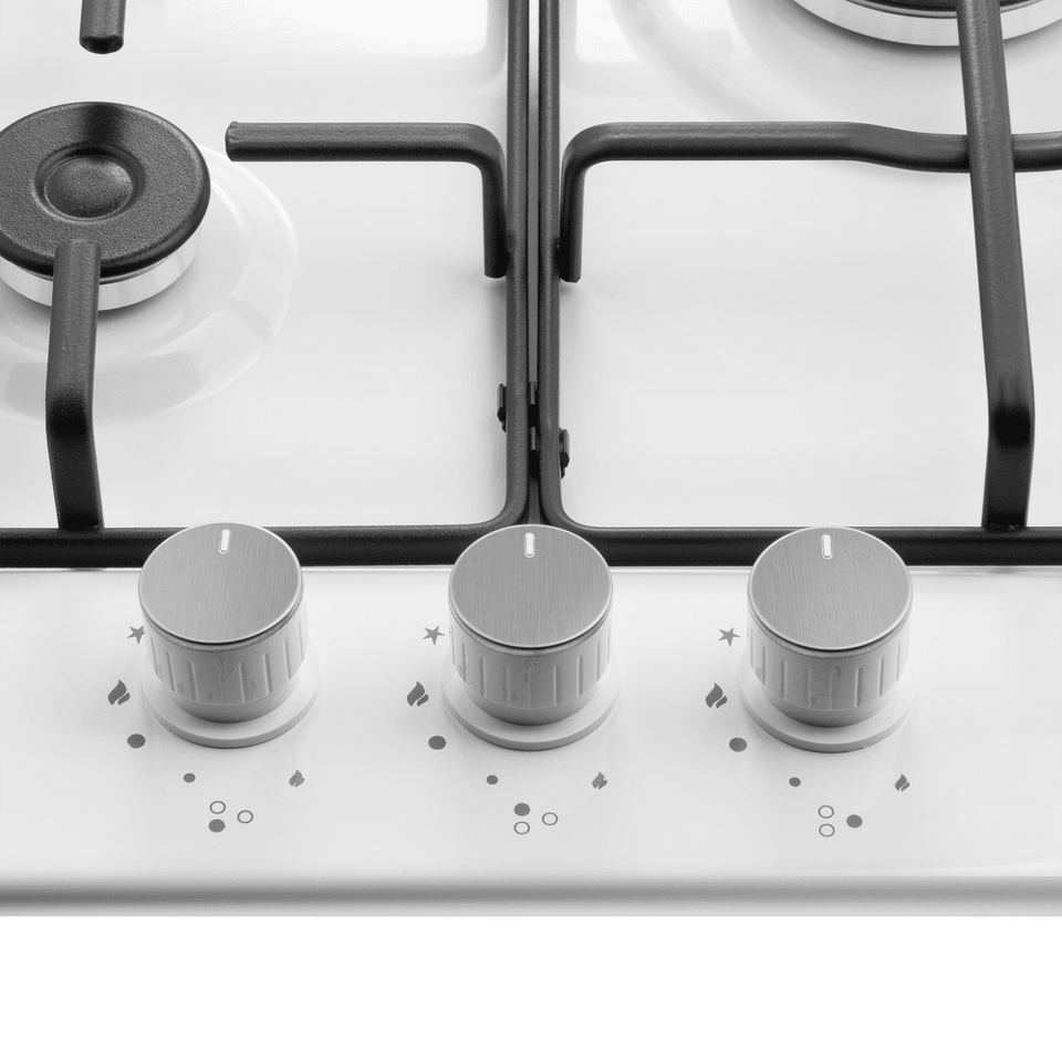 Управление подачи газа и электроподжиг конфорок происходит с помощью поворотных регуляторов - ручек из высокопрочного термостойкого пластика. Для простоты использования около каждой ручки нанесены информационные изображения: используемая конфорка, подача газа выключена, электроподжиг, максимальное пламя и минимальное пламя.