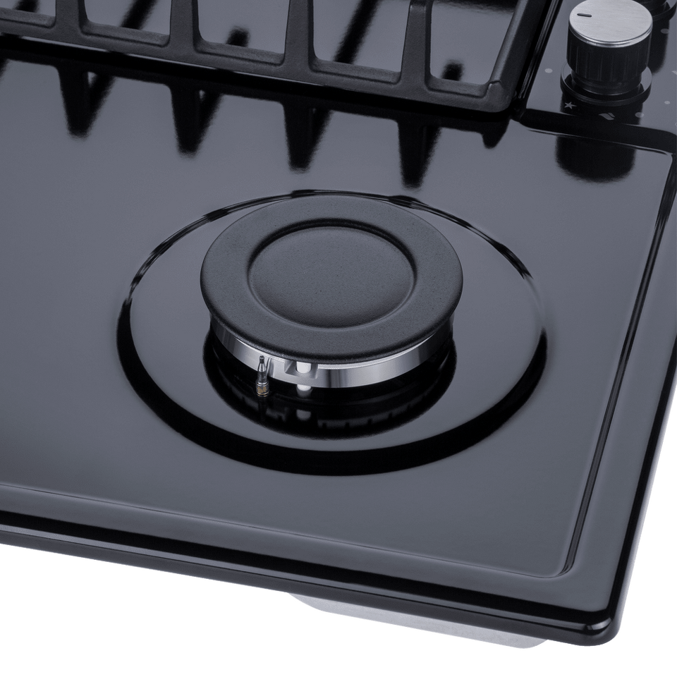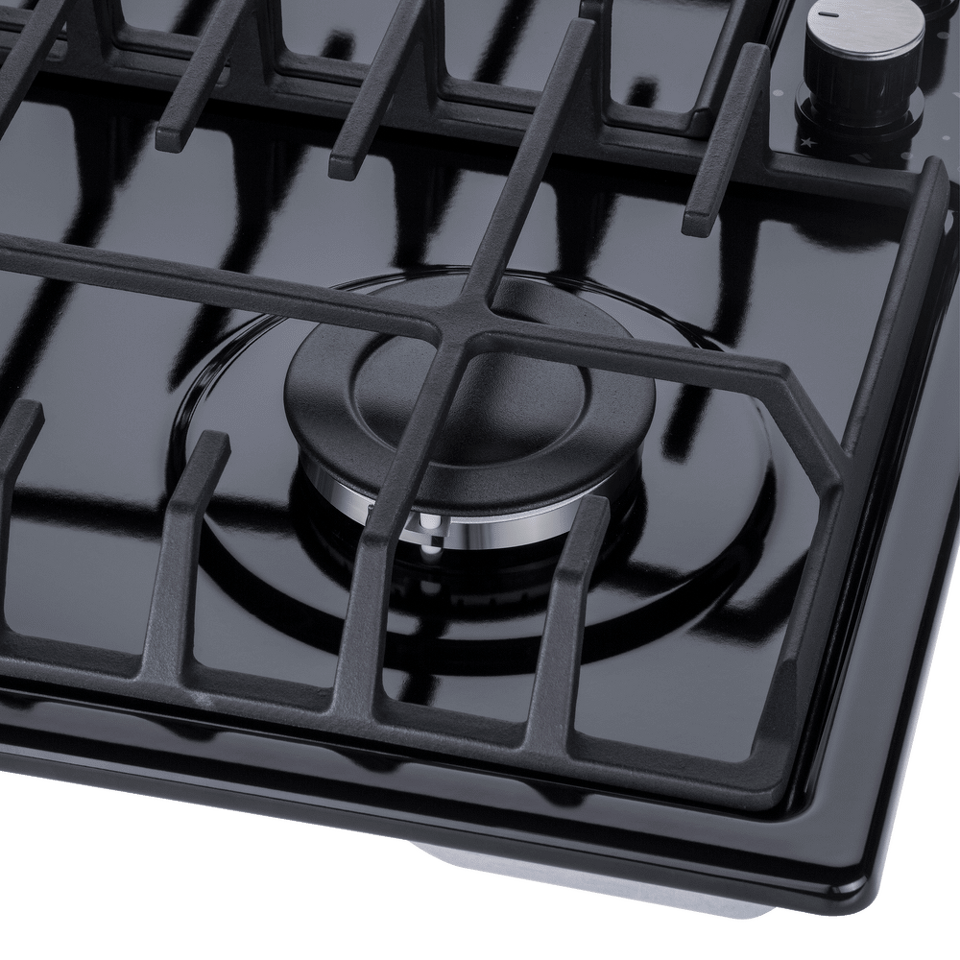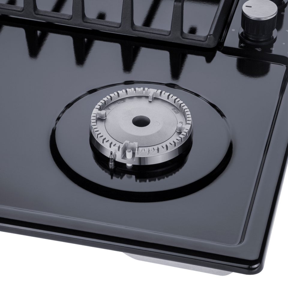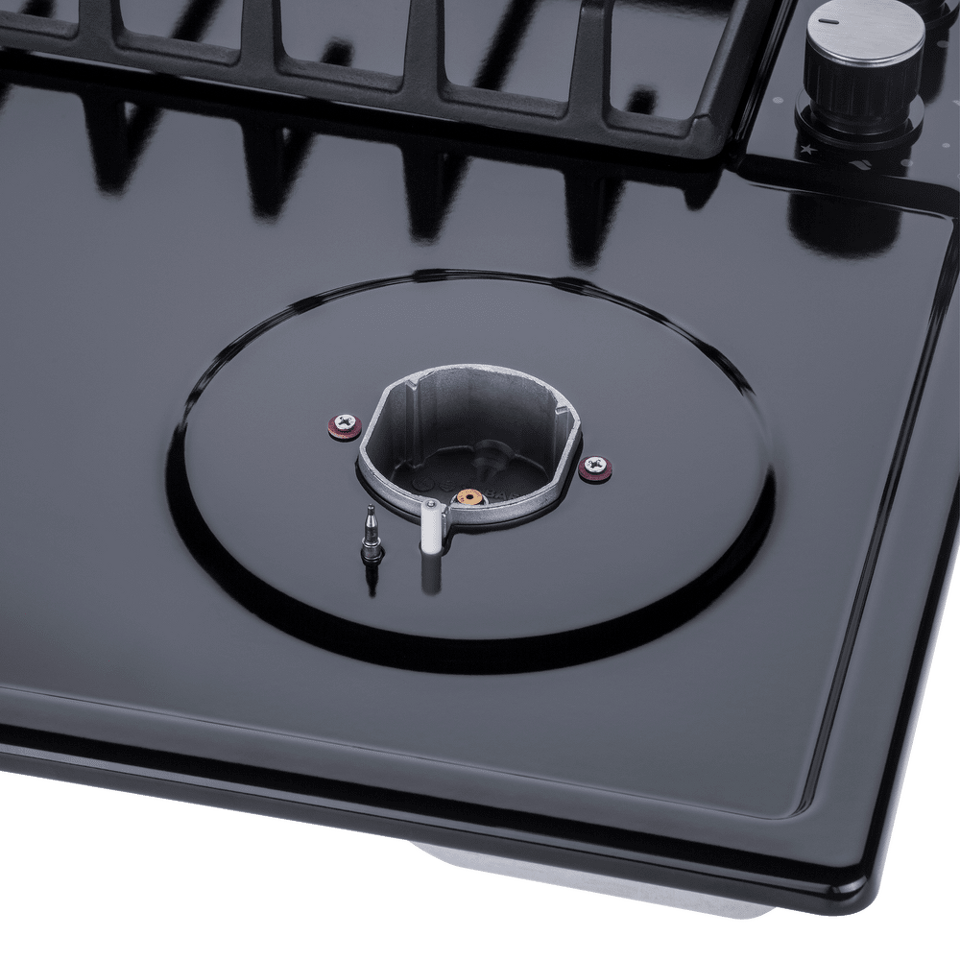 Панель выполнена из металла, покрытого термостойкой прочной эмалью черного цвета. Четыре  стандартные итальянские конфорки SABAF мощностью 1000 Вт, 1700 Вт, 1700 Вт и 2600 Вт спроектированы таким образом, что огонь не перегревает ни чугунные решетки, ни ручки управления.