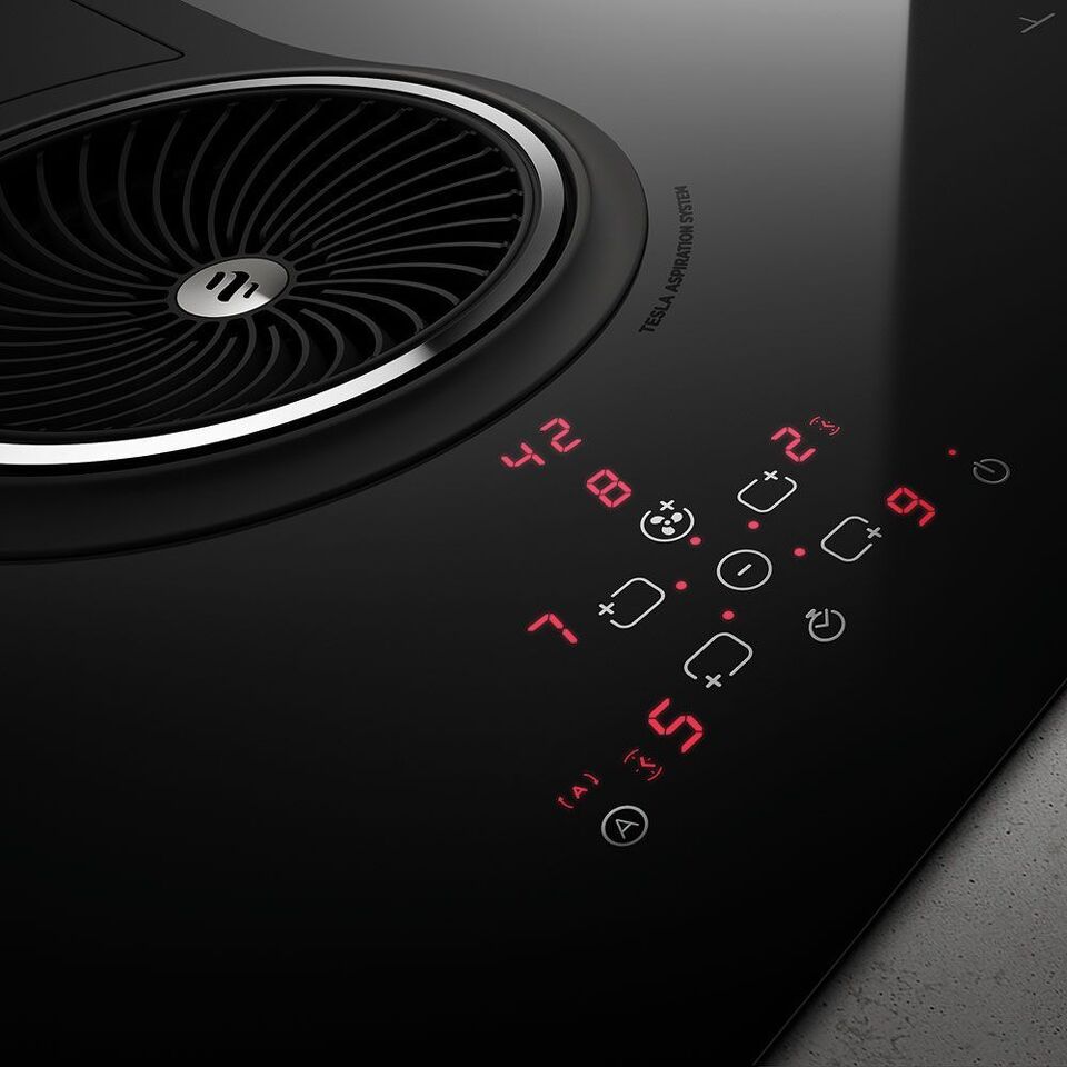 Дизайн. Революционная модель ELICA NIKOLATESLA BL/A/83 — индукционная варочная панель на 4 конфорки со встроенной мощной вытяжкой. Черная стеклокерамическая модель с фронтальной стороны дополнена панелью управления обоими устройствами.