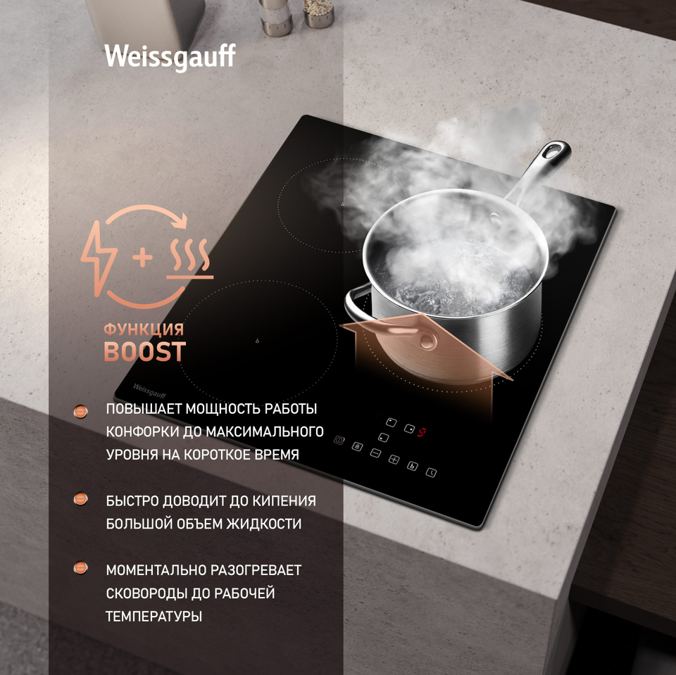 Индукционная панель Weissgauff с особым дизайном конфорок Boost-Zone выводит на новый уровень понимание того, насколько эффективной может быть компактная индукционная варочная поверхность шириной всего 45 см!