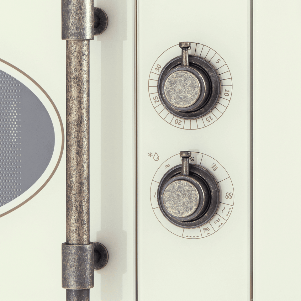 Особенности: без поворотного стола, фасад из прочного стекла, гриль, открытие дверцы в любом режиме, подсветка камеры, дверца навесная, механический таймер, звуковой сигнал, бронзовые цельнометаллические ручки управления.