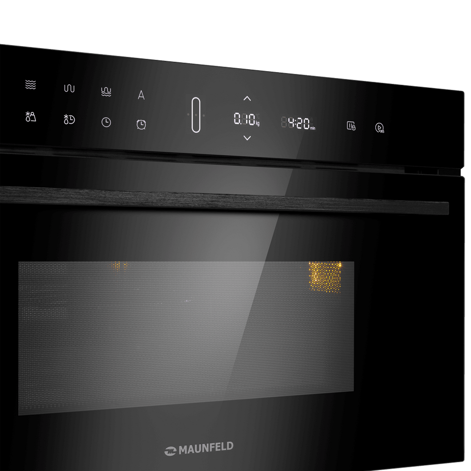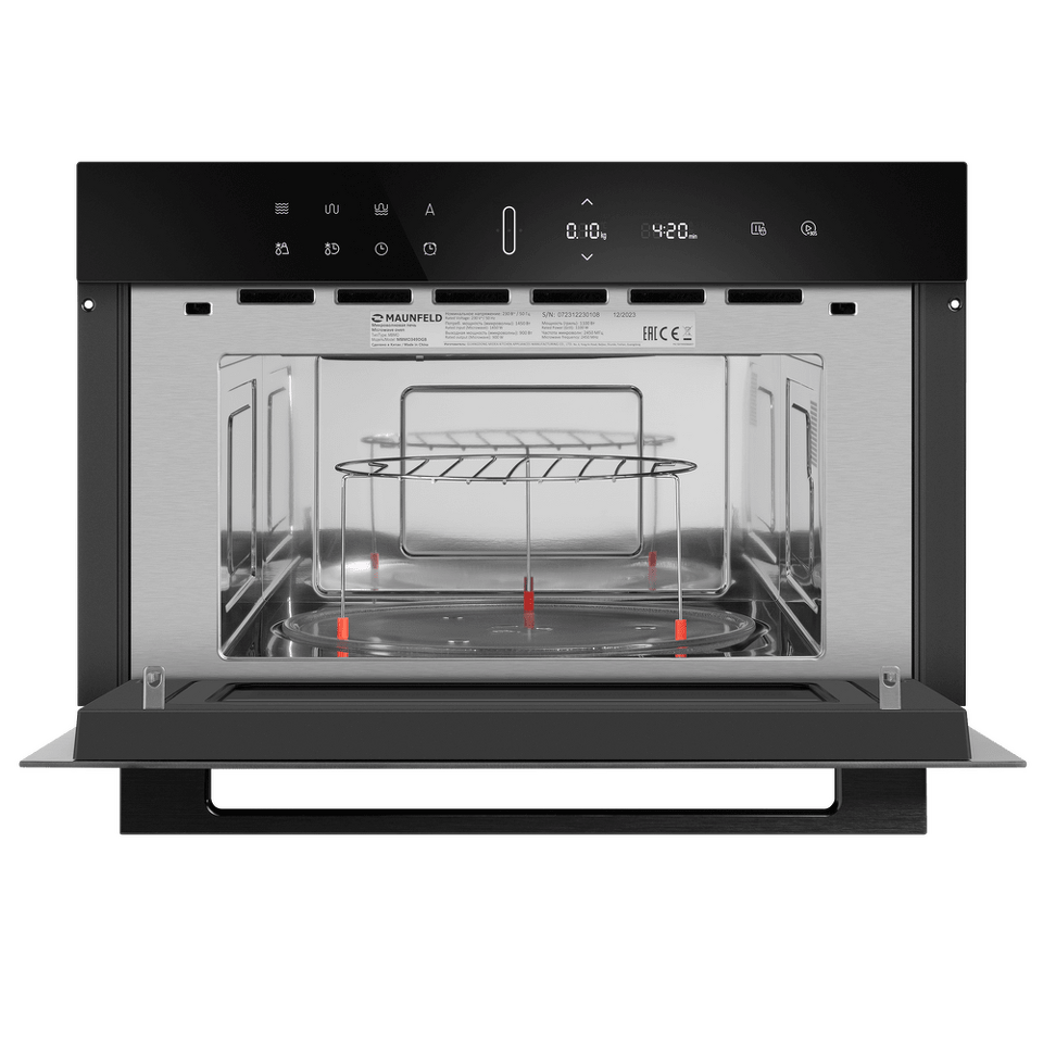 Микроволновая печь Maunfeld с горизонтальной панелью управления органично впишутся в интерьер Вашей кухни. Стеклянная дверца открывается сверху вниз, как в духовых шкафах. Рабочая камера этой печи имеет большой объём 34 л.