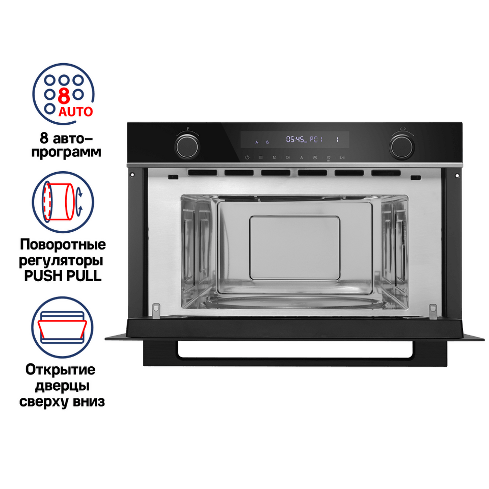 Встраиваемая микроволновая печь. Передняя панель выполнена из стекла. Свет зажигается при открытии дверцы. Настройка программ и таймера осуществляется при помощи сенсорного дисплея.