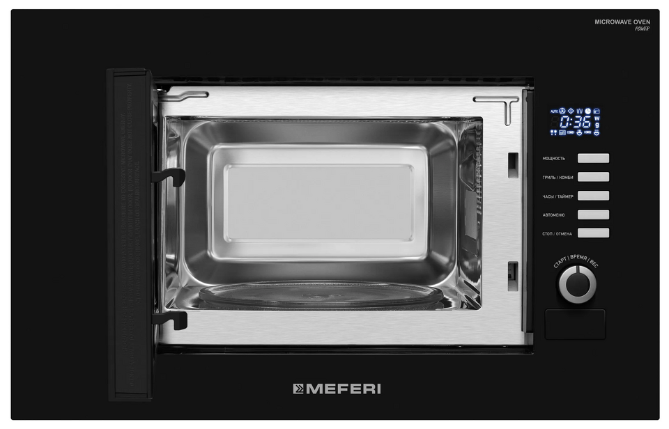 Микроволновая печь MEFERI MMO6020BK SLIM POWER — это стильное и мощное решение для вашей кухни, объединяющее современные технологии и удобство использования.Компактная конструкция для встраивания: Благодаря небольшим габаритам микроволновую печь можно легко встроить в верхнюю полку кухонного гарнитура, оптимально используя пространство.Максимальная мощность 1200 Вт: Благодаря высокой мощности, эта модель обеспечивает быстрое и равномерное приготовление блюд, что значительно сокращает время приготовления.Компактные размеры и стильный дизайн: Размеры 595х329х382 мм делают эту микроволновку идеальной для любой кухни, а элегантный черный цвет с современным дизайном отлично впишется в интерьер.Комбинированное управление и дисплей: Удобное управление в сочетании с информативным дисплеем позволяет легко настраивать режимы и контролировать процесс приготовления.8 программ авто-меню + режимы разогрева и разморозки: Модель оснащена 8 автоматическими программами, включая настройку по весу, а также режимами разогрева и разморозки, что делает процесс приготовления максимально простым и точным.Гриль и решетка в комплекте: Встроенный кварцевый гриль и решетка позволяют готовить блюда с аппетитной корочкой, расширяя возможности кулинарных экспериментов.Разморозка по весу: Точная разморозка по весу обеспечивает равномерное и безопасное размораживание продуктов без лишних усилий.Таймер до 95 минут и кнопка быстрого старта: Продвинутые функции позволяют контролировать время приготовления и быстро запускать процесс разогрева блюд.Защита от детей и внутреннее покрытие из нержавеющей стали: Безопасность и легкость в уходе — важные преимущества этой модели.Диаметр поворотного стола 245 мм: Обеспечивает равномерное прогревание и размораживание больших порций.