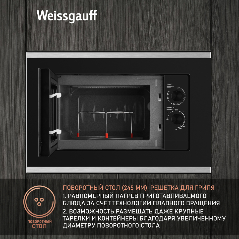 Встраиваемая микроволновая печь Weissgauff с объемом 20 литров, выполненная в черном закаленном стекле со вставками из нержавеющей стали, равномерно разогревает еду при помощи поворотного стола, а также оснащена грилем с возможностью работы в комбинированном режиме!