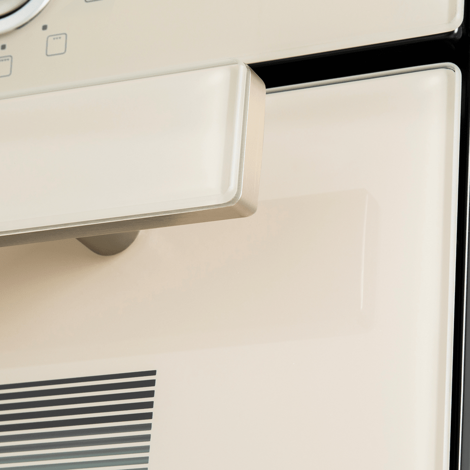 Фронтальная панель духовки и фасад ручки дверцы сделаны из высококачественного жаропрочного стекла бежевого цвета, окрашенного по всему объему, что является отличительной чертой бытового прибора премиум-класса.