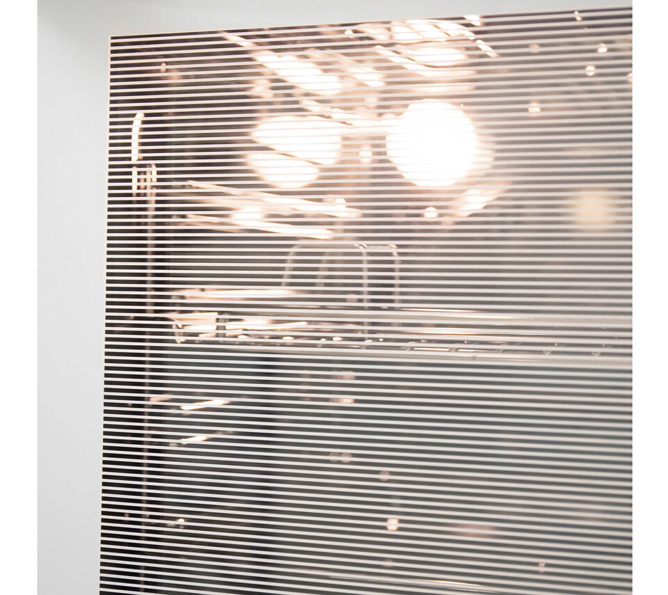 Фронтальная панель духовки сделана из высококачественного жаропрочного тонированного стекла белого цвета. Цельнометаллическая ручка дверцы остается холодной в процессе готовки.