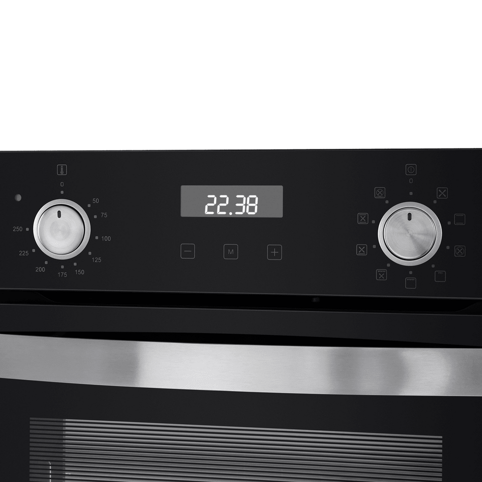 Комбинированное управление реализовано в виде сенсорного дисплея и поворотных ручек PUSH PULL, которые легким нажатием убираются внутрь корпуса. Можно выбрать режим работы, температуру (50°-250°C), установить таймер и блокировку от детей. В данной модели есть 9 режимов: верхний/нижний нагрев, усиленная конвекция, гриль/верхний нагрев/конвекция, разморозка, гриль/верхний нагрев, гриль, конвекция с нижним нагревом, нижний нагрев, интенсивная выпечка, освещение.