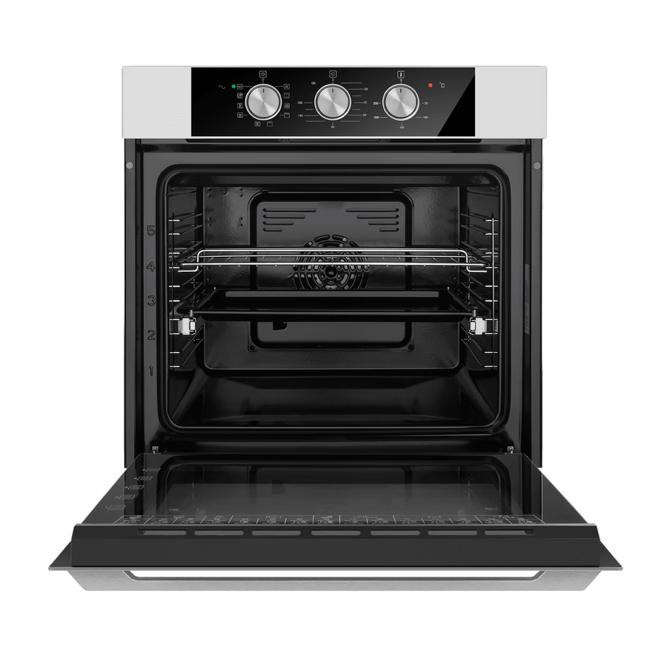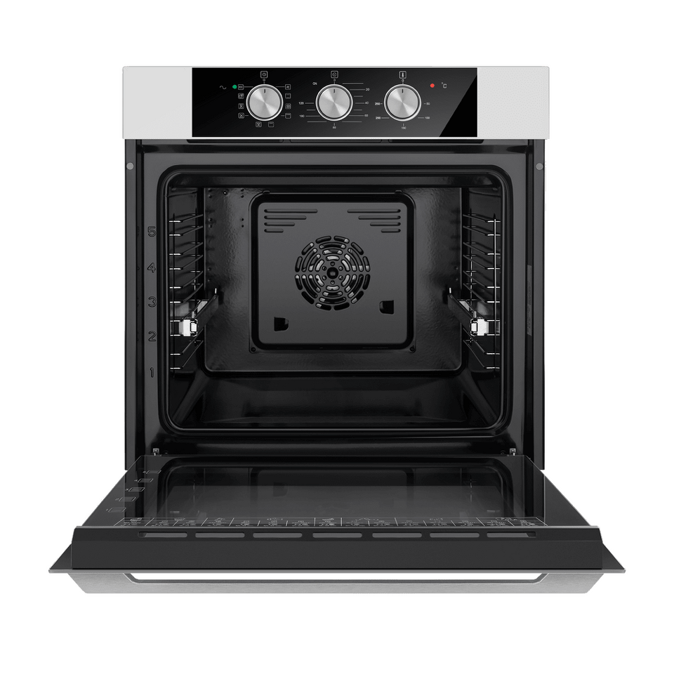 Встраиваемый электрический духовой шкаф с объемом 76 литров оснащен удобными телескопическими направляющими и простым механическим управлением с утапливаемыми переключателями.